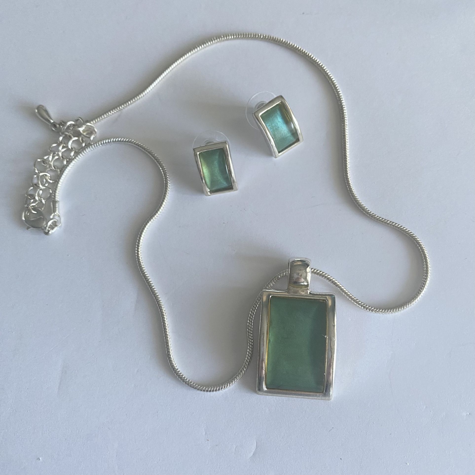 Mod Soft Green Silver Tone Necklace Pierced Earrings Jewelry Set