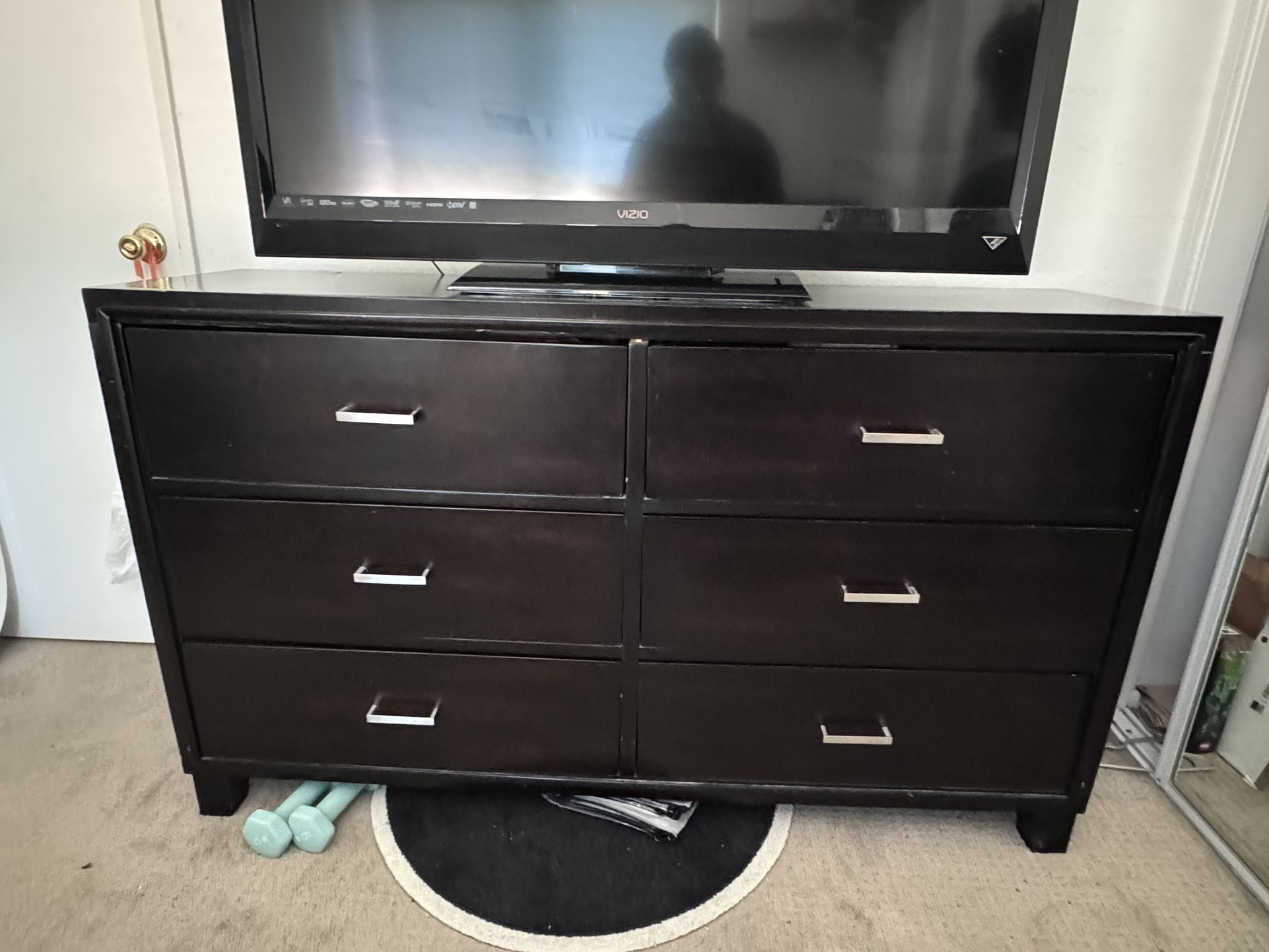 black 6 chest dresser. 58” wide, 16” deep, and 36” tall. minor scratches and staining on the top of the dresser.