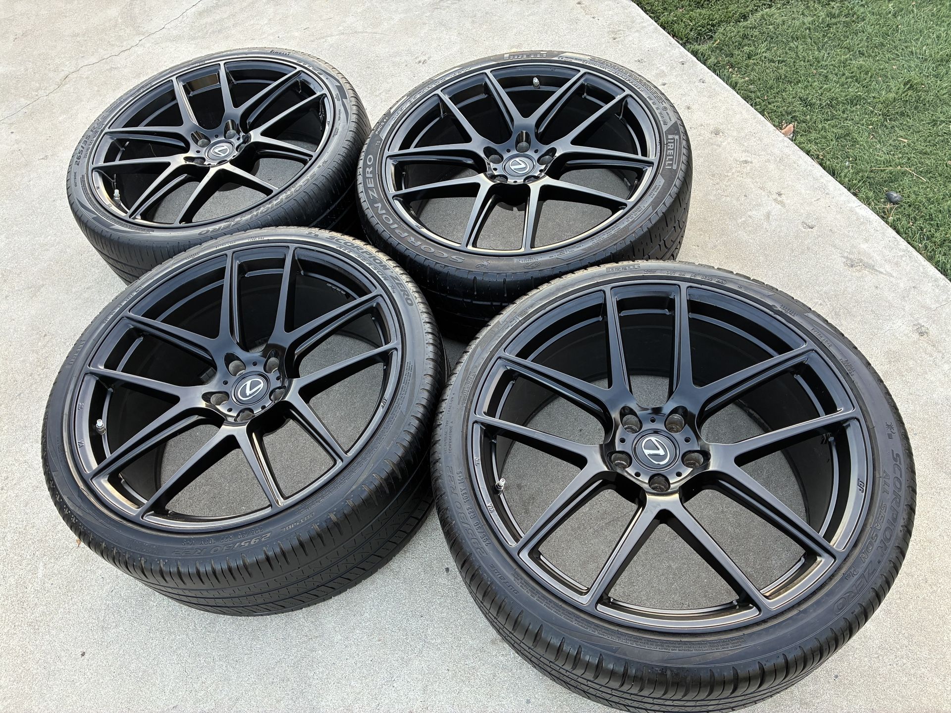 Rims 22 LEXUS Staggered gloss black rines Rear 22x10.5 tires 295/30/22 OFFSET 30 Front 22x9 tires 265/35/22 OFFSET 15 All 4 rims and tires hold air No cracks No repairs No leaks air 5x120 lug pattern