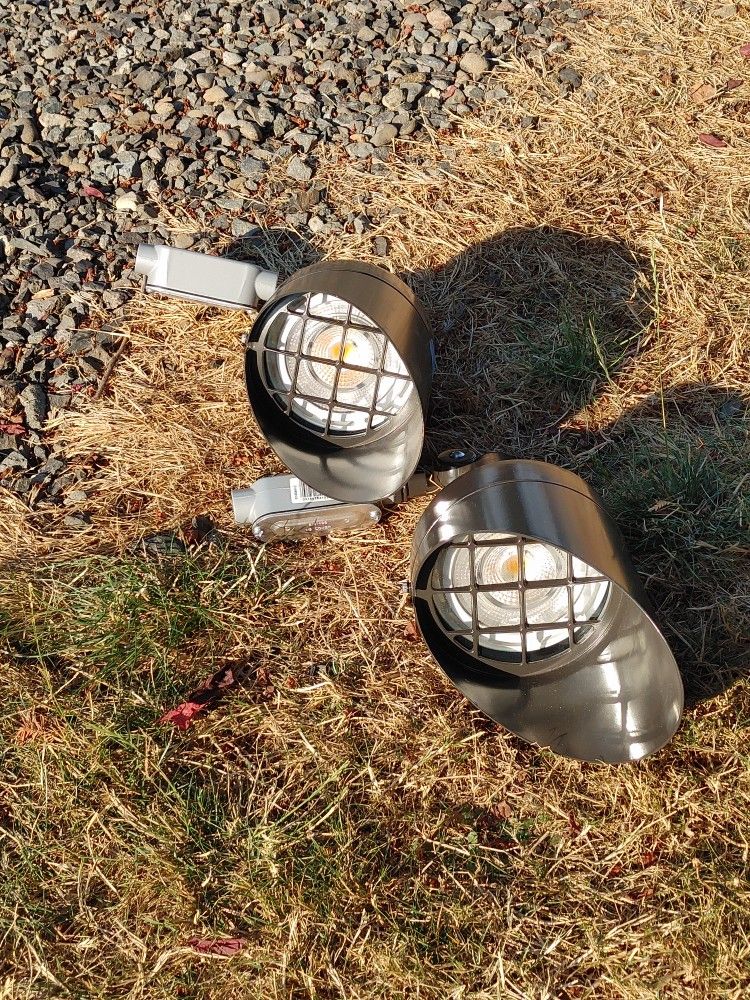Pair of outdoor spotlights with visors and PAR 38 dimable bulbs. Used once for indoor event. New price on everything $136. Asking $65, less than half new. Bulbs are Sylvania "Night Chaser" 23W, 2650 Lumens, dimmable.