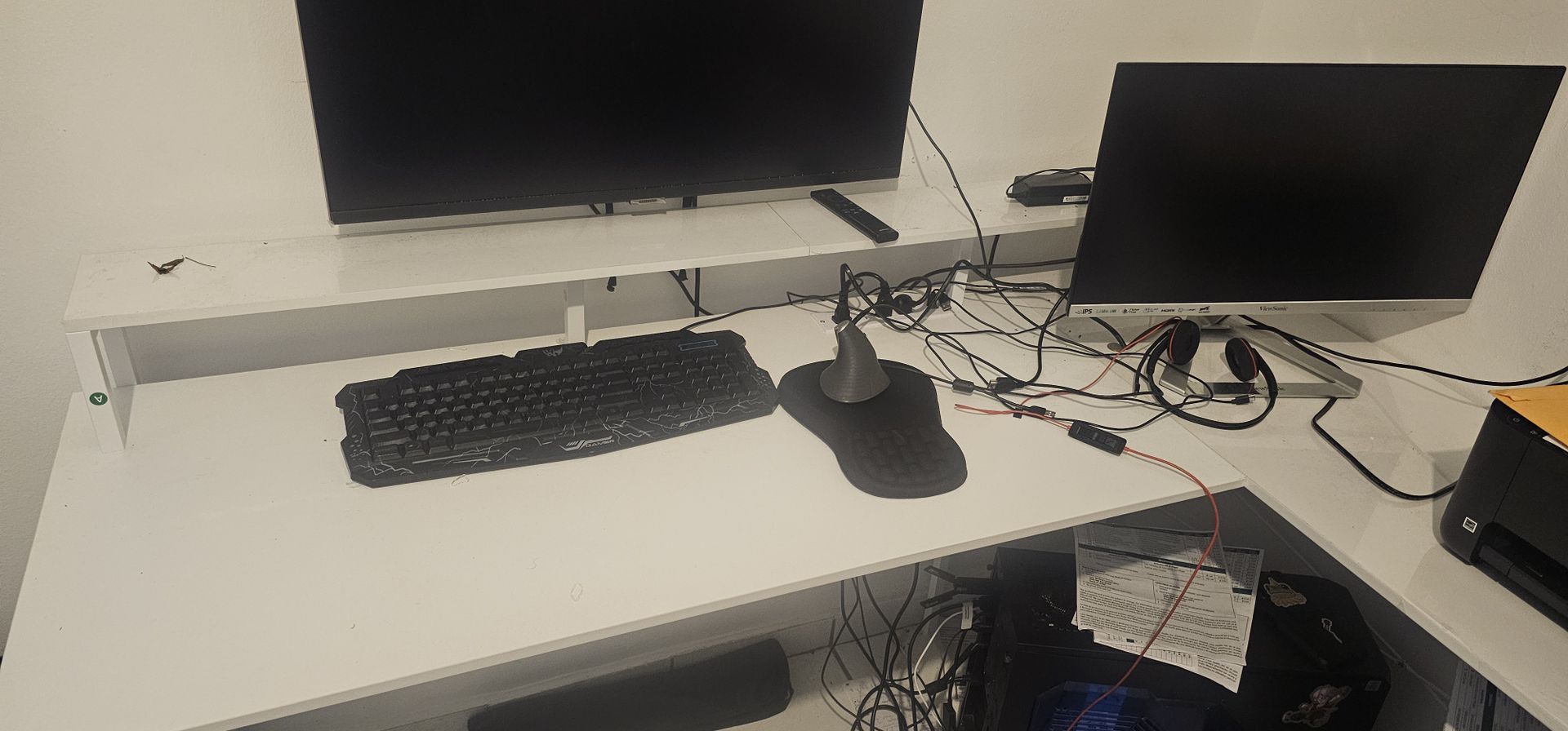 Features: Built-in power strip (4 AC outlets + 2 USB ports) Rated power: 1500W Large desktop surface for dual monitors Corner design for space efficiency Sturdy metal frame Integrated cable management Perfect for home office, gaming setup, or remote work. Clean. Modern. Ready for immediate pickup. Características: Regleta integrada (4 enchufes + 2 puertos USB) Potencia nominal: 1500W Superficie amplia para doble monitor Diseño de esquina que optimiza espacio Estructura metálica resistente Sistema de organización de cables Ideal para oficina en casa, estudio o gaming. Limpio, moderno y listo para recoger.