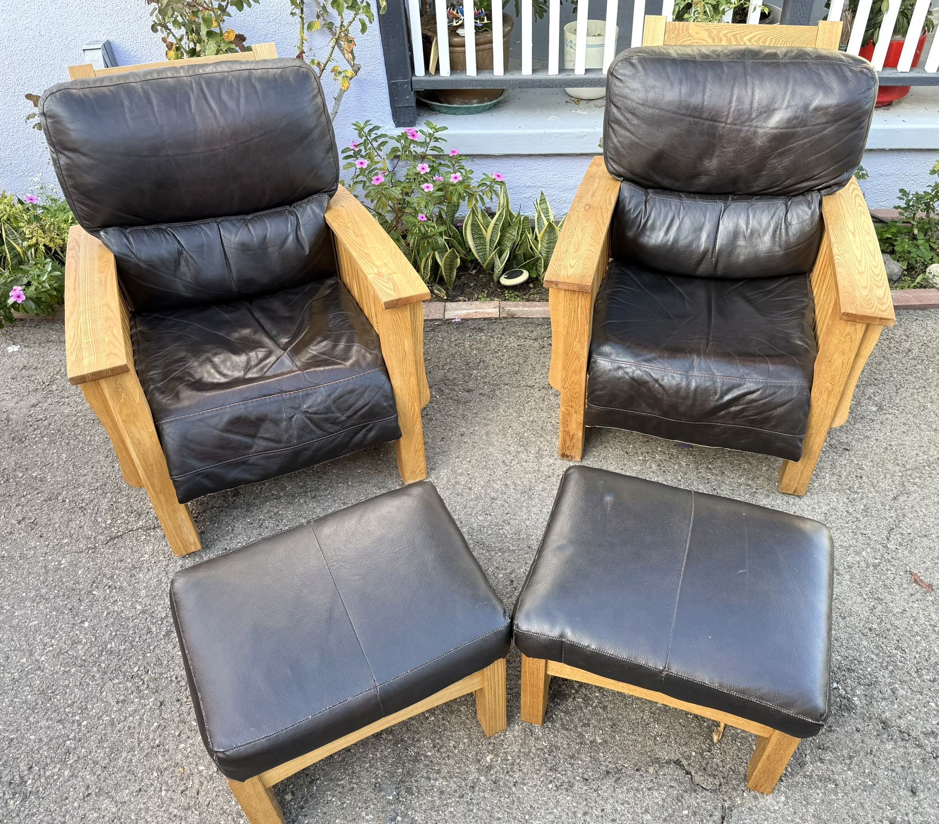 A set of beautifully, hand crafted Mission/ Craftsman style club chairs with matching ottomans. They are made from solid white oak. The cushions are a full grain chocolate leather. The dimensions are: single chair - 31” wide 37” from front to back 41” tall Single ottoman - 17” wide 16” from front to back 22” tall I would like to sell them as a pair and as a set. But if I absolutely have to split them up, pricing is as follows: 1 chair - $450 1 ottoman - $75 1 set (1 chair and 1 ottoman)-$525 Both sets(2 chairs 2 ottomans)-$1000 Please no low ball offers, look up what these chairs cost. A single new chair can cost in excess of 2, 3, or even 4K. Any questions, ask away.