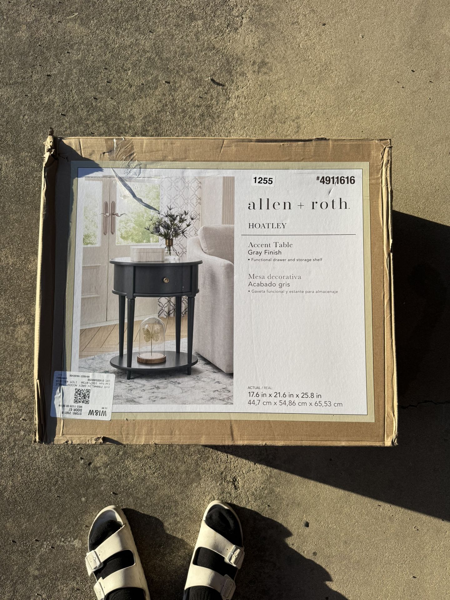 Brand new in the box Allen Roth end table in grey. Very nice and easy to put together.
