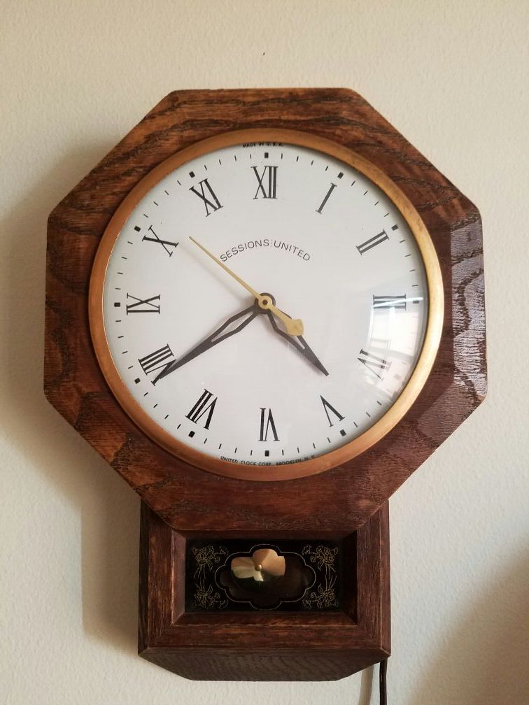 Sessions: United Wall Clock // Vintage Mid Century Wooden Electric Wall Clock Roman Numeral School House Style USA Made Eagle Design. Works perfectly fine.