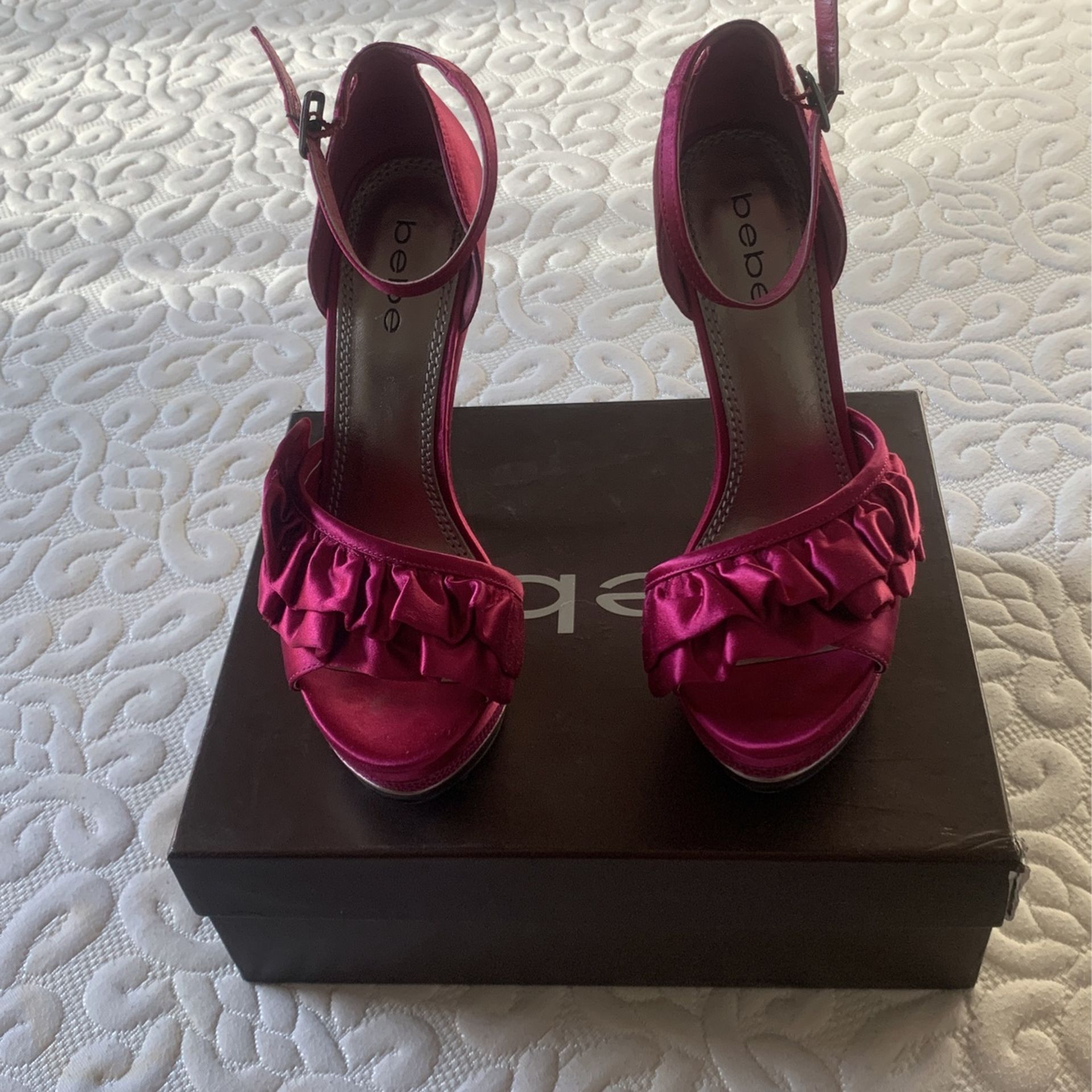 Fuchsia Pink Satin with Leather accent. Size 7. Minimal wear, like new. 5" heel. Tips like new. No flaws, imperfections, no scuffs. Super cute, sexy, fun shoe!