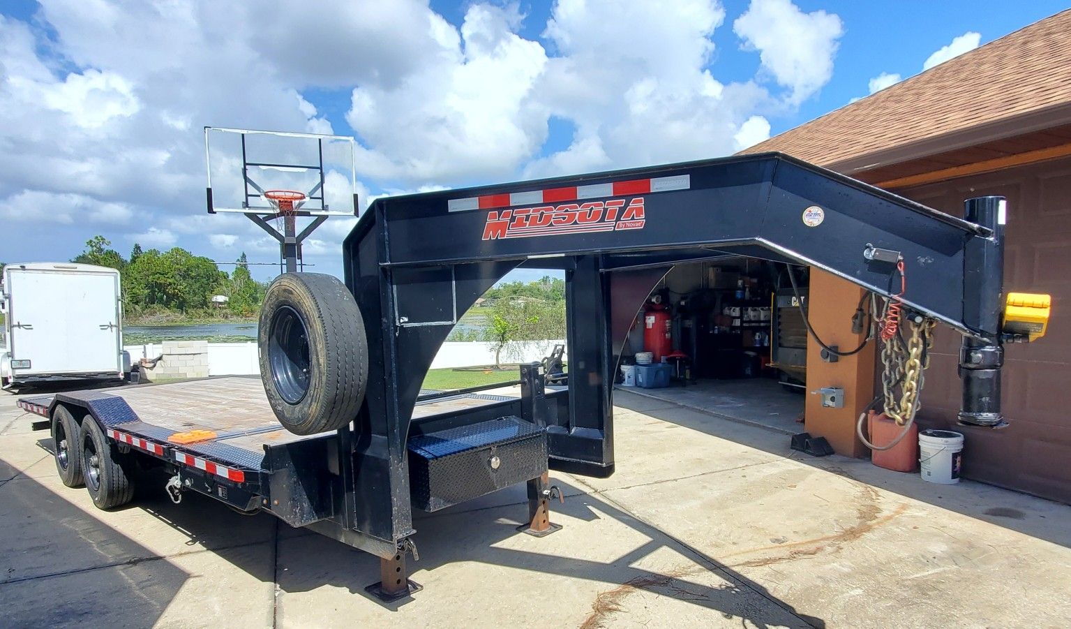 2022 Midsota model NTBWB22-GN-230 Wide-Body Gooseneck Gravity Tilt-Bed Equipment Trailer w/ Lippert torsion axles 22 ft long bed (18+4) 102" wide weight = 5950 lbs GVWR = 23,000 lbs Payload = 17,050 lbs Needs Nothing