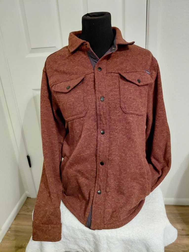 Eddie Bauer Women's Medium Shirt Jacket/Shacket. Cozy, rust-colored heathered fleece with snap buttons, two chest pockets, and two hand pockets. Great for layering and casual warmth.
