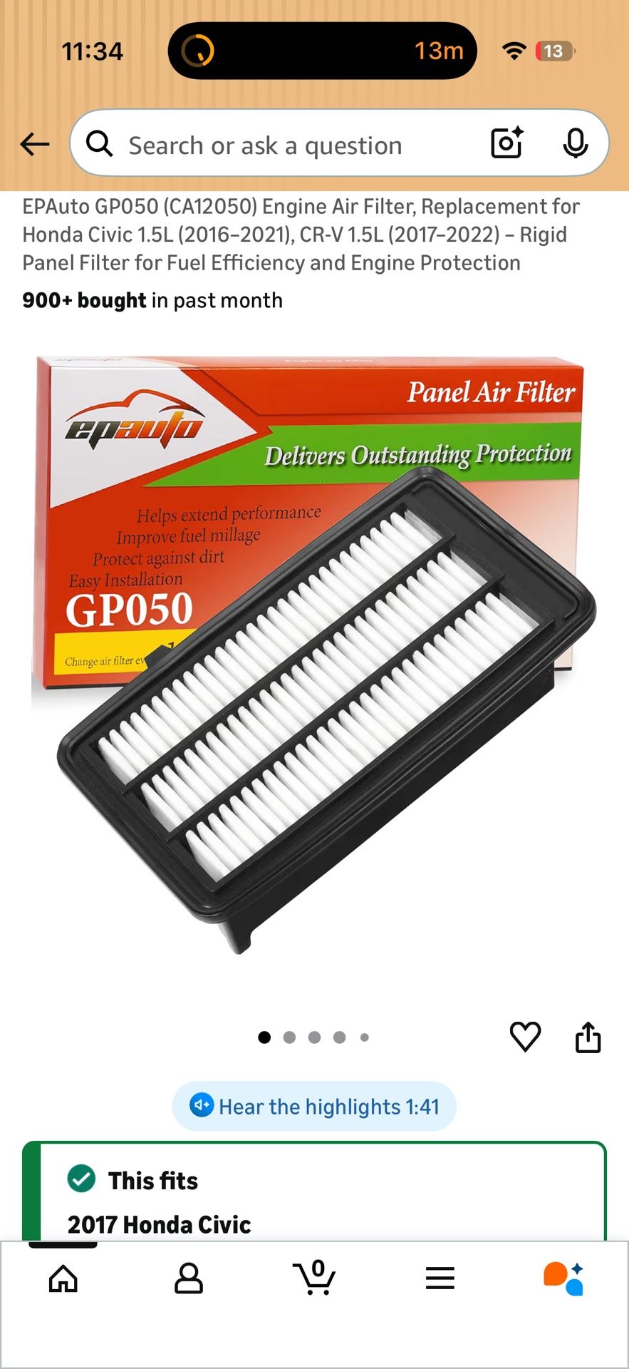 NEW Engine Air Filter for 2016 - 2021 Honda Civic
