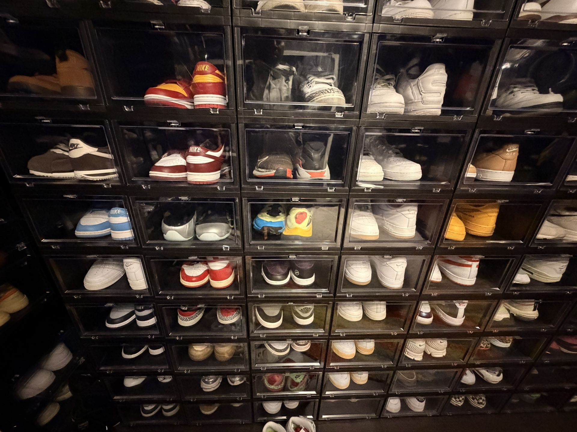 Price: $12 per box (Bundle pricing available) Description: Selling multiple black drop-front shoe storage boxes from The Container Store. These are the stackable sneaker display cases with clear magnetic front doors — perfect for organizing and showcasing a collection. • Durable black frame with clear front panel • Drop-front magnetic door for easy access • Stackable and modular • Fits most standard sneakers (Jordans, Air Forces, Dunks, etc.) • Clean, well-maintained condition Great for collectors or anyone looking to upgrade closet organization with a clean, uniform look. Available individually or in bulk. Pickup preferred. Message for quantity available and bundle pricing.