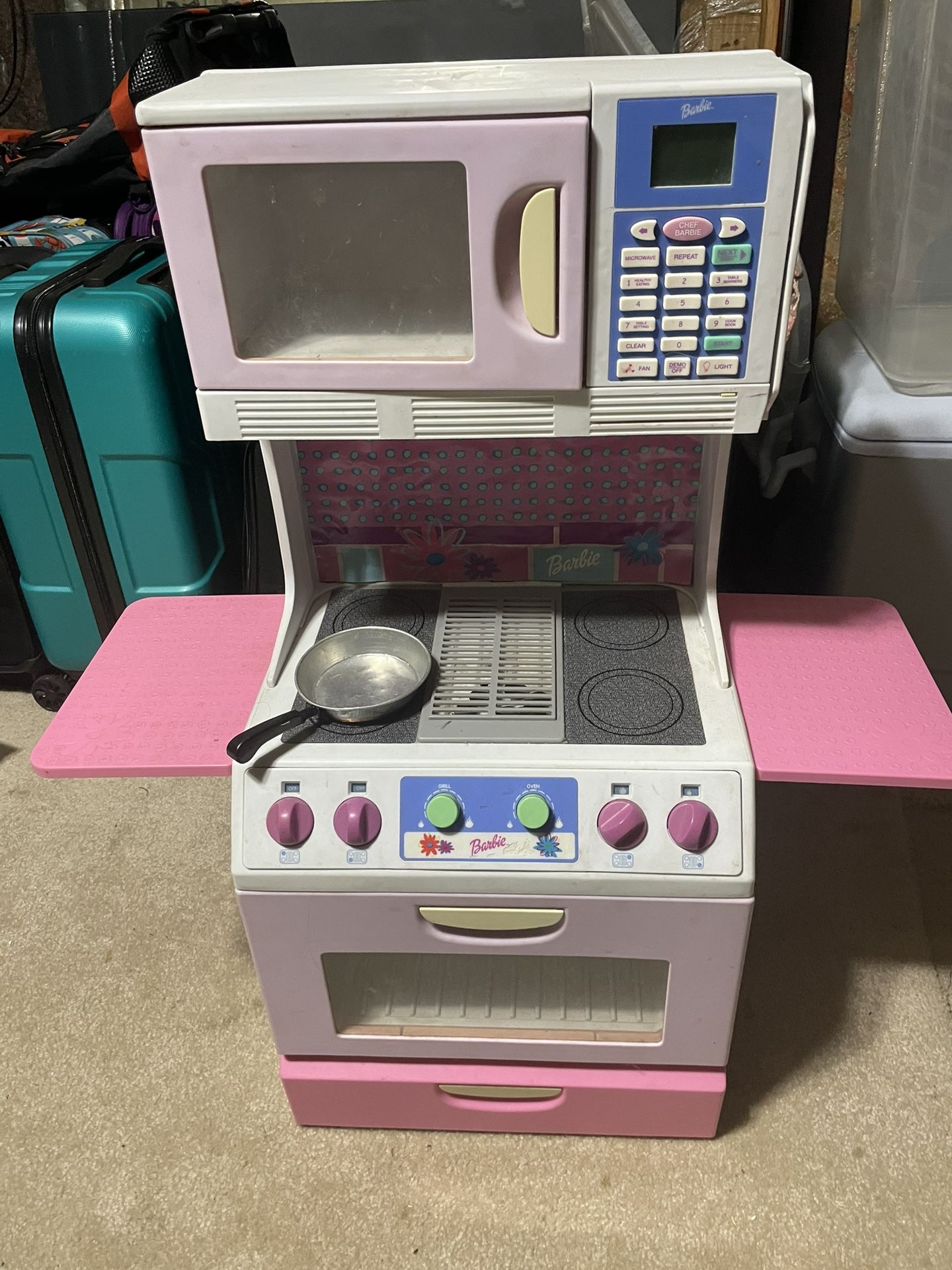 Barbie Small Play Kitchen, 30” H x 26” W x 12” D. stove, oven, microwave oven for burners, the knobs turn but this no longer works with batteries. underneath the oven center grate there’s a bunch of pennies that I can’t get out. Habla Espanol