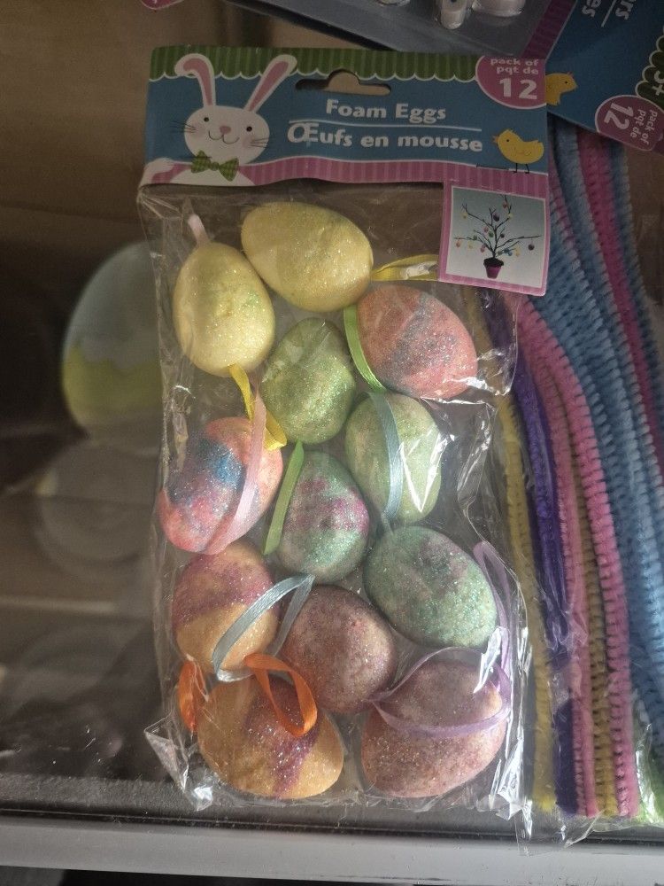 Greenbrier International Foam Easter Egg Ornaments featuring multicolored glitter and hanging loops.