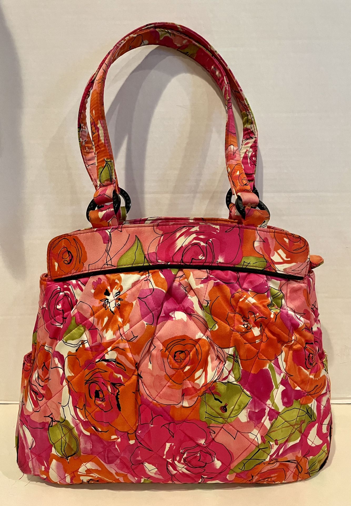 Vera Bradley floral large handbag tote. 13.5” L x 12”H x 4”W. Double handles with a 10.5” drop. Soft satin material.