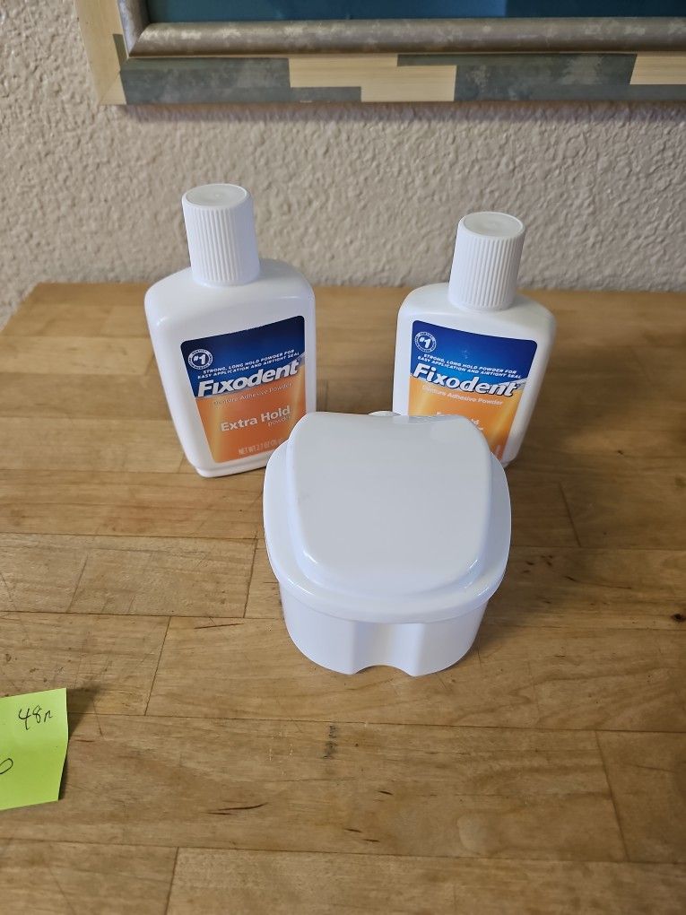 5 2.7oz. Bottles $8.31 a bottle on Amazon 2 1.6 oz. Bottles $9.99 a bottle on Amazon $61.53 total on Amazon if buying in bulk. 1 free denture tray