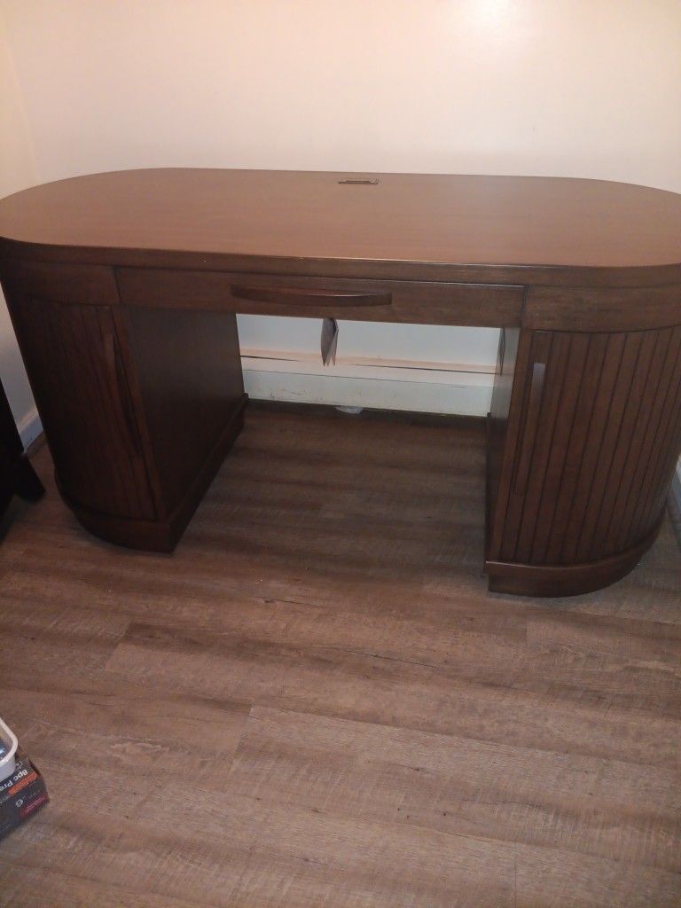 This is a brand new Ashley wooden desk brought it for $780 last year and never been used. Has two side doors. Nice wood furniture for any room, whether living room or office area.