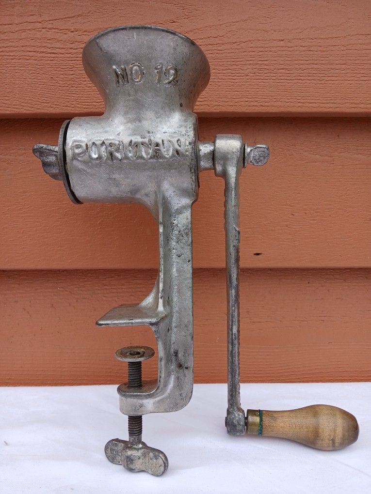 Original No. 12 Model hand crank meat grinder this is typically the size of the grinder head and plates. Features a clamp to attach it to a table or counter. Indicated on grinder : Puritan, on the handel says The Gris World MFG. CO. ERIC. PA. USA. On inside of handle is the number 2470. Wood Handle Grip.