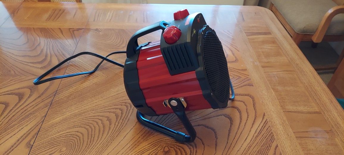 This Craftsman ceramic electric heater has only been used just a few times. It is suitable for use in your home, garage, or workshop. The heater offers two settings—750 watts and 1500 watts—as well as a fan-only mode and has a durable all-metal body. Features include: 5120 BTUs, 4-position switch, Adjustable thermostat, Safety overheat protection, Safety tip-over switch, 6-foot power cord, Power and caution indicators lights. Dimensions are approximately 8.5 inches wide by 8.5 inches deep by 11 inches high.