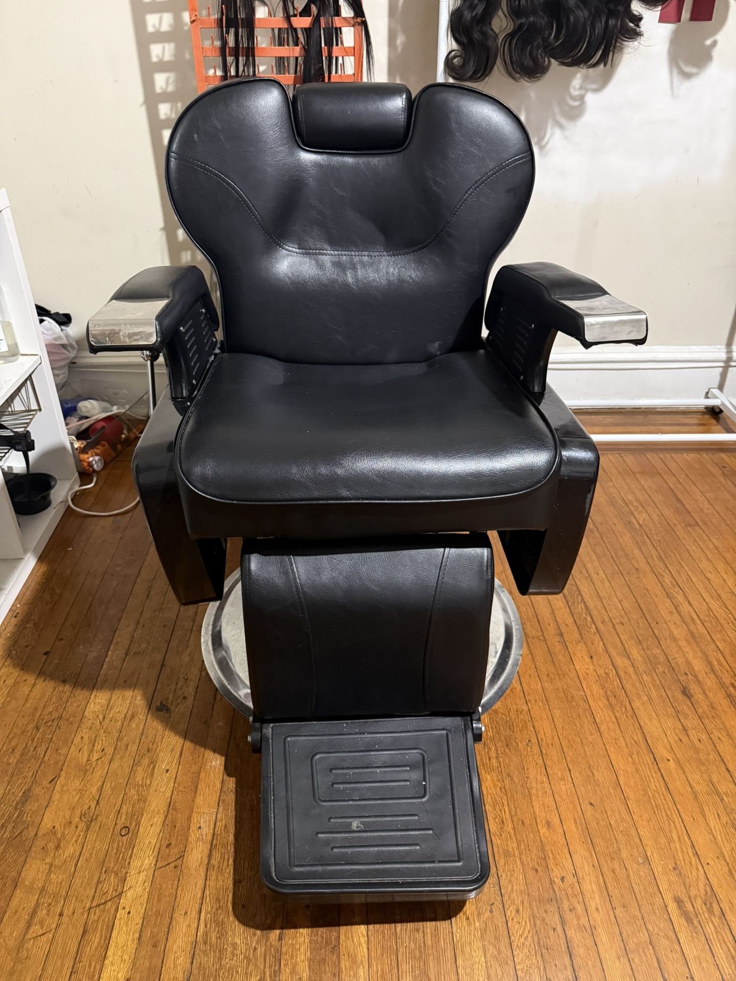 Black barber/ salon chair head rest is adjustable. Still in really good condition. Handle was place incorrectly so the chair does not recline. Still works and looks great.