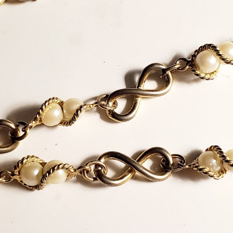 A vintage gold-tone infinity link necklace and matching bracelet with caged faux pearls. Necklace is 17.5" and the bracelet is 8" long.