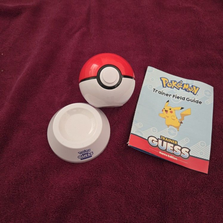 Pokémon Trainer Guess Kanto Edition Poké Ball Electronic Guessing Game. Trainer Ball identifies the Pokémon you're thinking of through a series of questions using speech recognition, allowing the Poké Ball to understand and respond without buttons or reading. Comes with Poké Ball, Field Guide, and batteries. Field Guide has some writing in it.