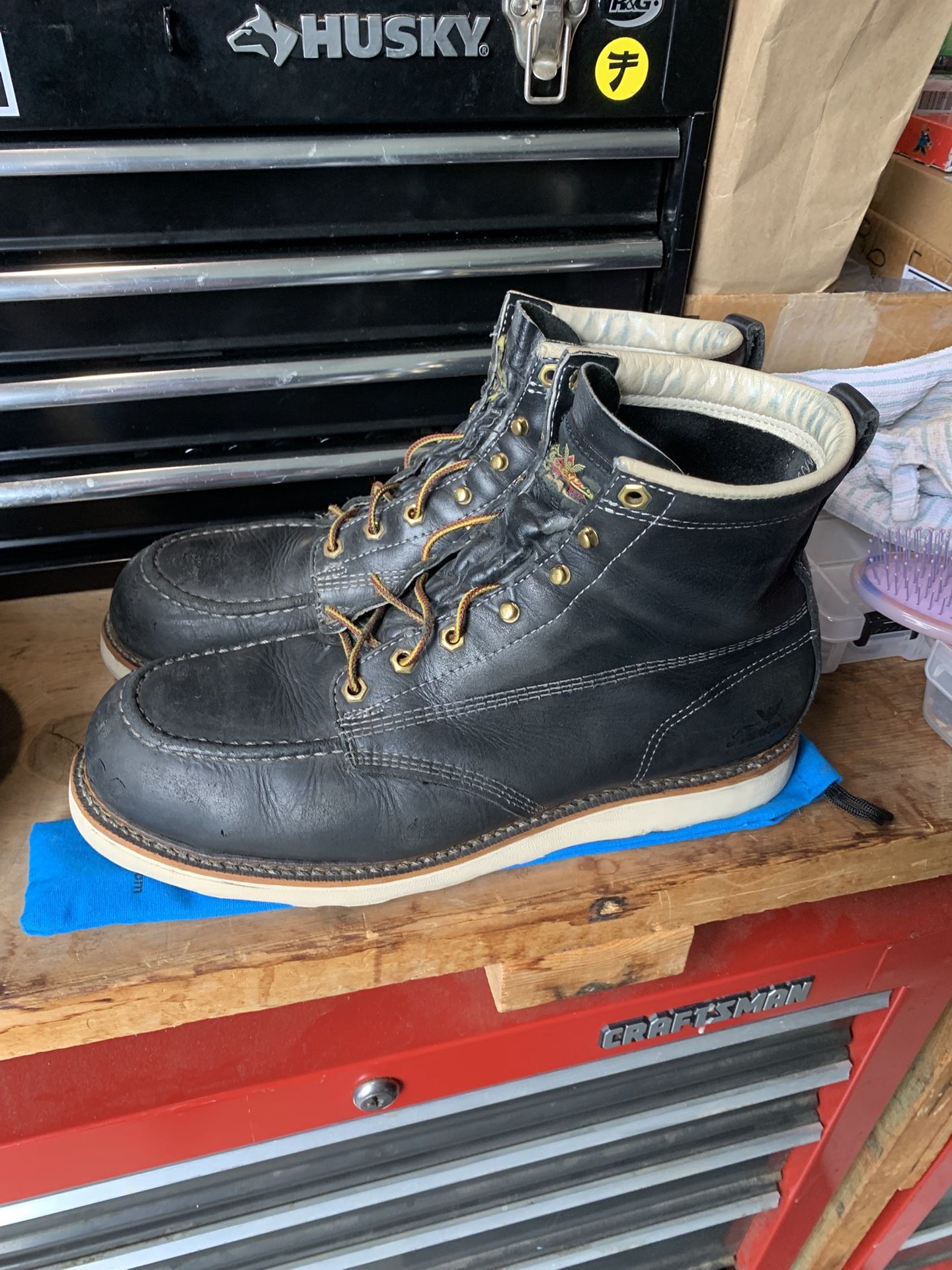 Thorogood safety toe / steel toe boots. Black leather with new vibram soles. These are size 12D. Made in USA! Changed jobs and no longer need steel toes. These are good for another 100k miles.