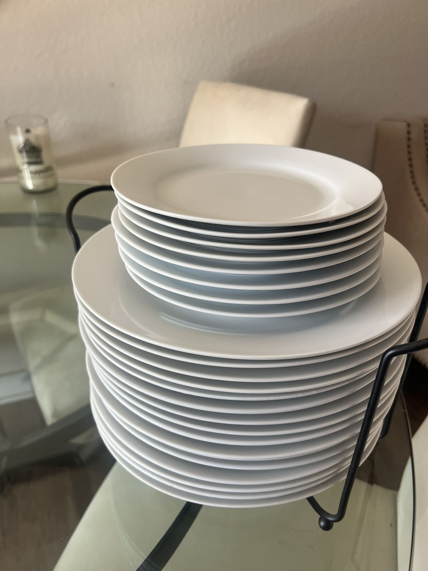 This is an excellent mixed lot of white porcelain plates, all in pristine, like-new condition. The set is perfect for large gatherings, catering, or everyday use, offering a cohesive, clean look despite the mixed brands. Total Pieces: Approximately 24 Plates + 1 Metal Rack Includes Highly Sought-After Restaurant Ware: • 8 PLATES FROM THE PALM RESTAURANT: 4 large dinner plates and 4 small plates. These are genuine commercial-grade porcelain, known for their durability and collectible value. The plates are marked "The Palm Restaurant," are Microwave Safe, and Dishwasher Safe. Includes Functional Everyday Plates: • Approx. 16 PLATES (IKEA & World Market): The remaining plates are high-quality white porcelain from brands like IKEA and World Market, matching the simple, minimalist style of The Palm plates.
