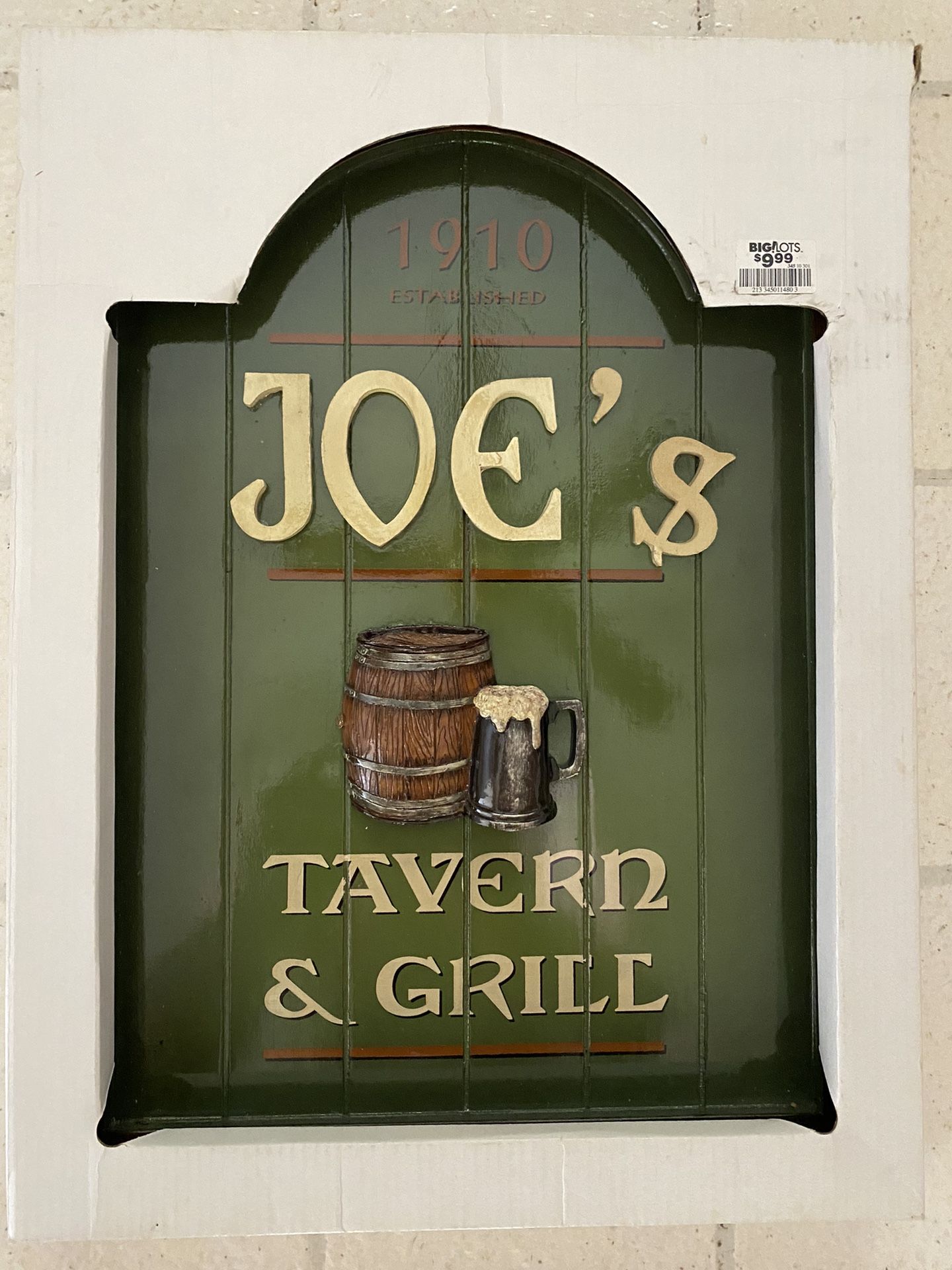 Joe’s Tavern and Grill sign, never used, in original packaging. Dimensions: 12“ x 16“ Two hooks in the back to hang up