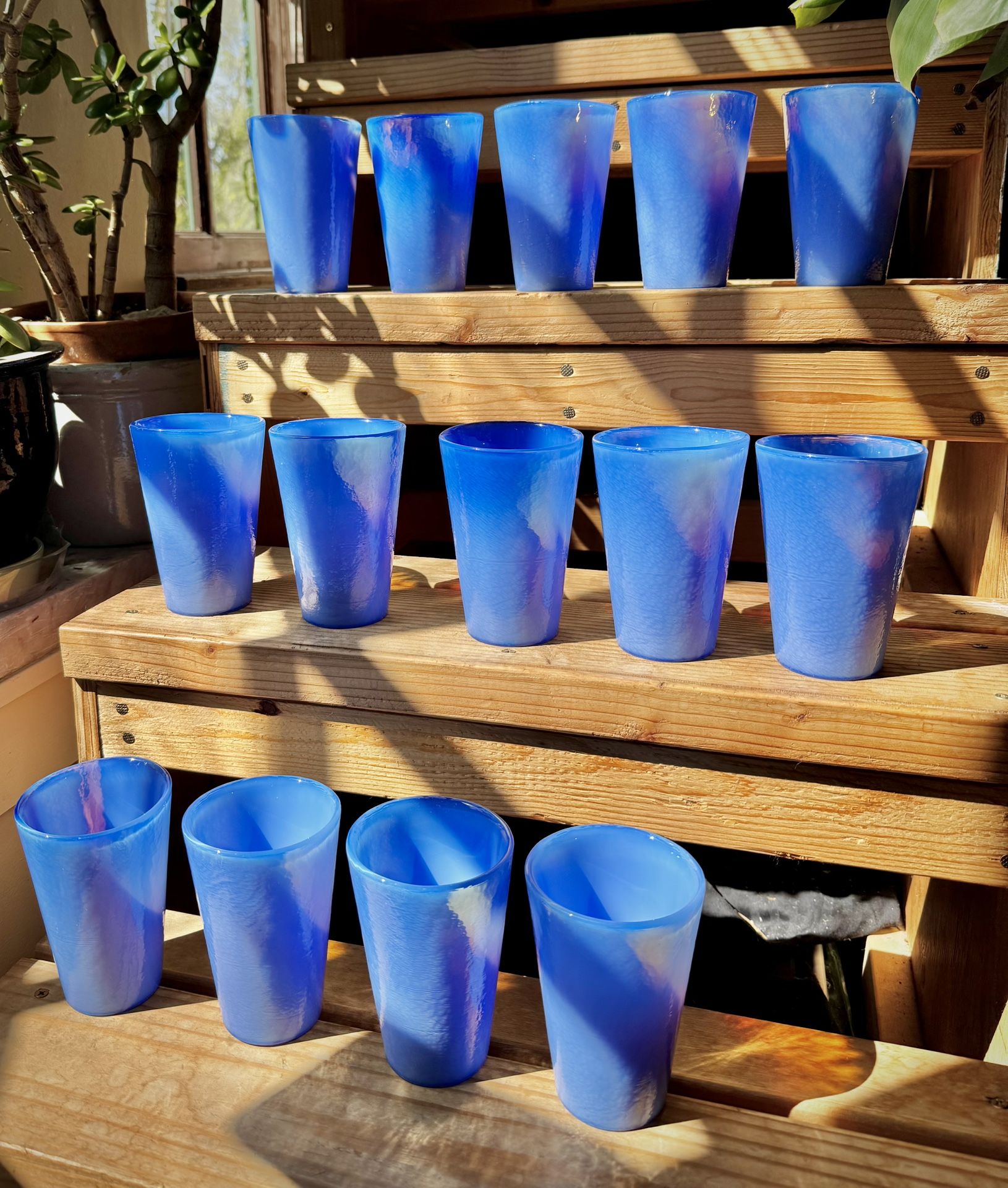 Beautiful opaline periwinkle blue Murano glasses. 5” tall, holds 14 oz $560 for set of 14