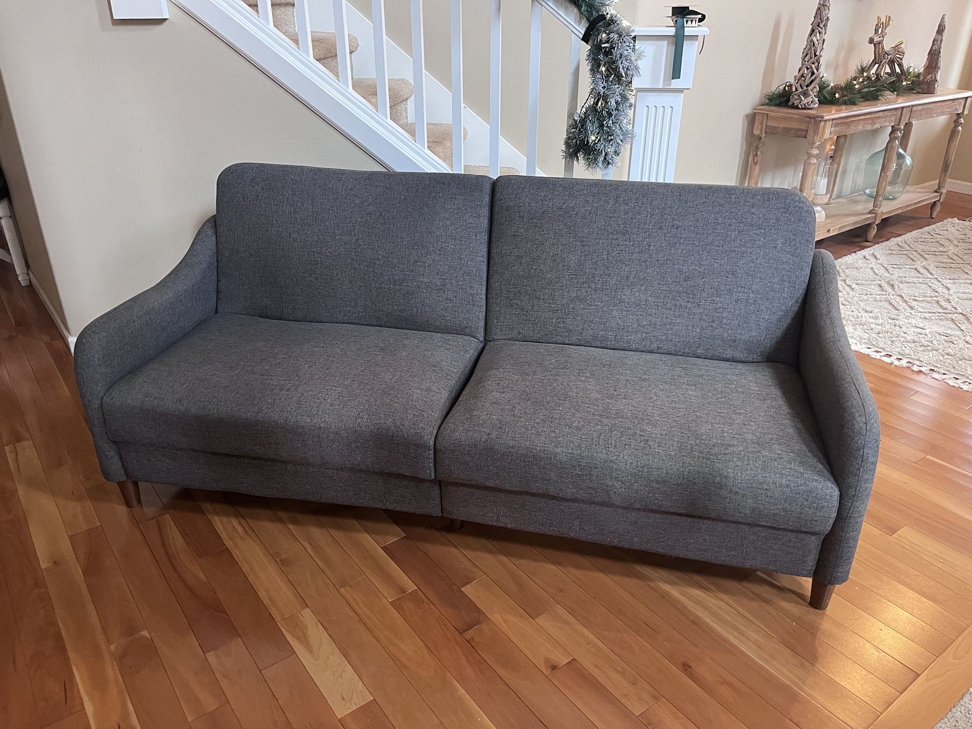 Grey futon sofa couch Good condition Will deliver for extra located in Monroe Width 34in length 77in height 34 Futon 44inx 77in Asking $220