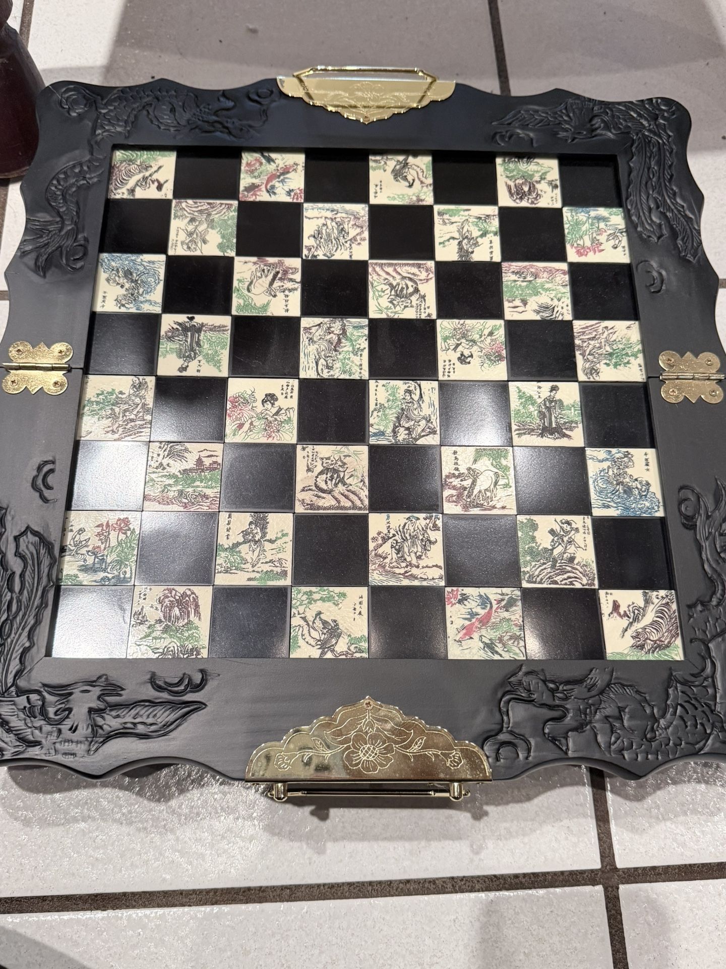 The board is made of carved wood with black and white/cream inlaid tiles. Minor chip on corner of wood exterior. Please refer to photos. Please evaluate pictures to determine condition of items. Contact seller for additional information or pictures. What you see in the picture is what you get. Pictures can look different on different monitors. Items are sold as is so make sure it's exactly what you want and ask all questions before making purchase all items stored in non-smoking environment. No returns Please leave favorable feedback and if you're not happy please contact me before putting unfavorable comment. Thanks for viewing my item and have a great day