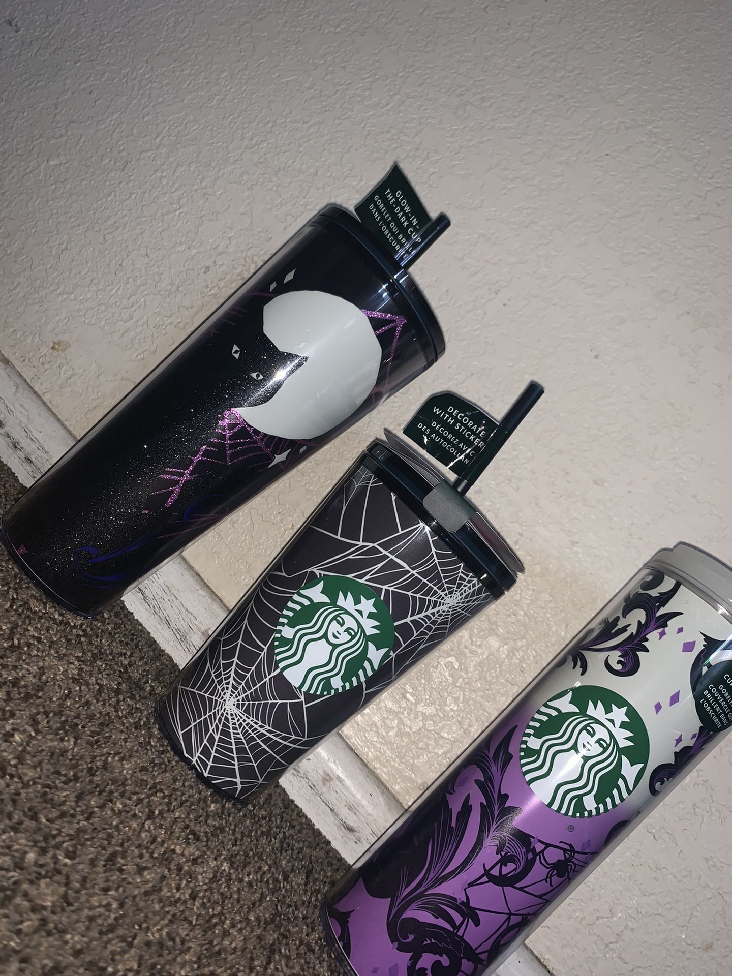 Halloween Starbucks cups 40$ for the black cat one And the white one 25$ Black spider web one 30$