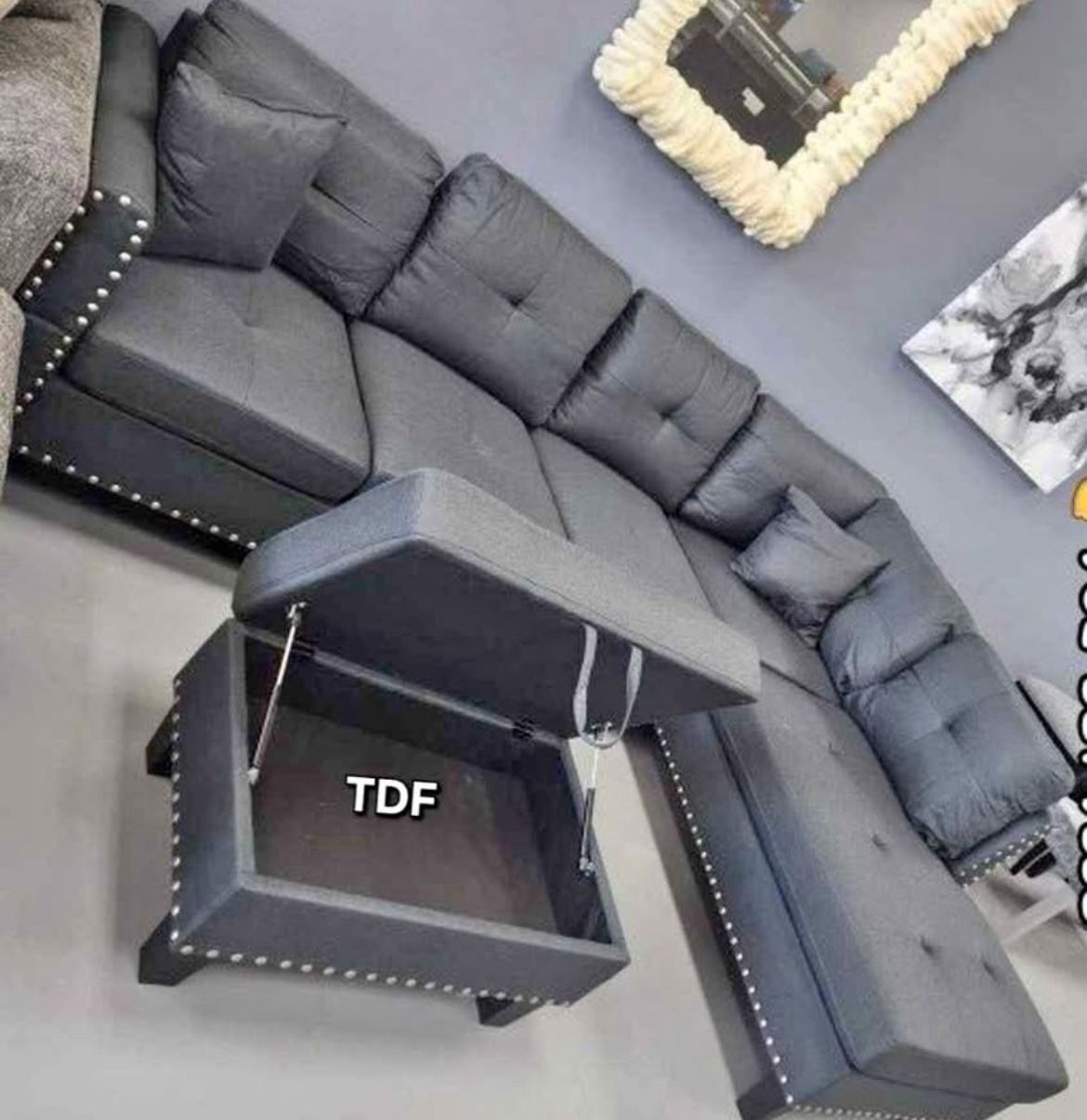 Brand new Charcoal color Linen Sectional Sofa with storage ottoman and 2 accent pillows and cup holders. Comes new in 3 boxes. Assembly required. Right facing chaise. 98x70x34h. Delivery π for additional fee. Firm price