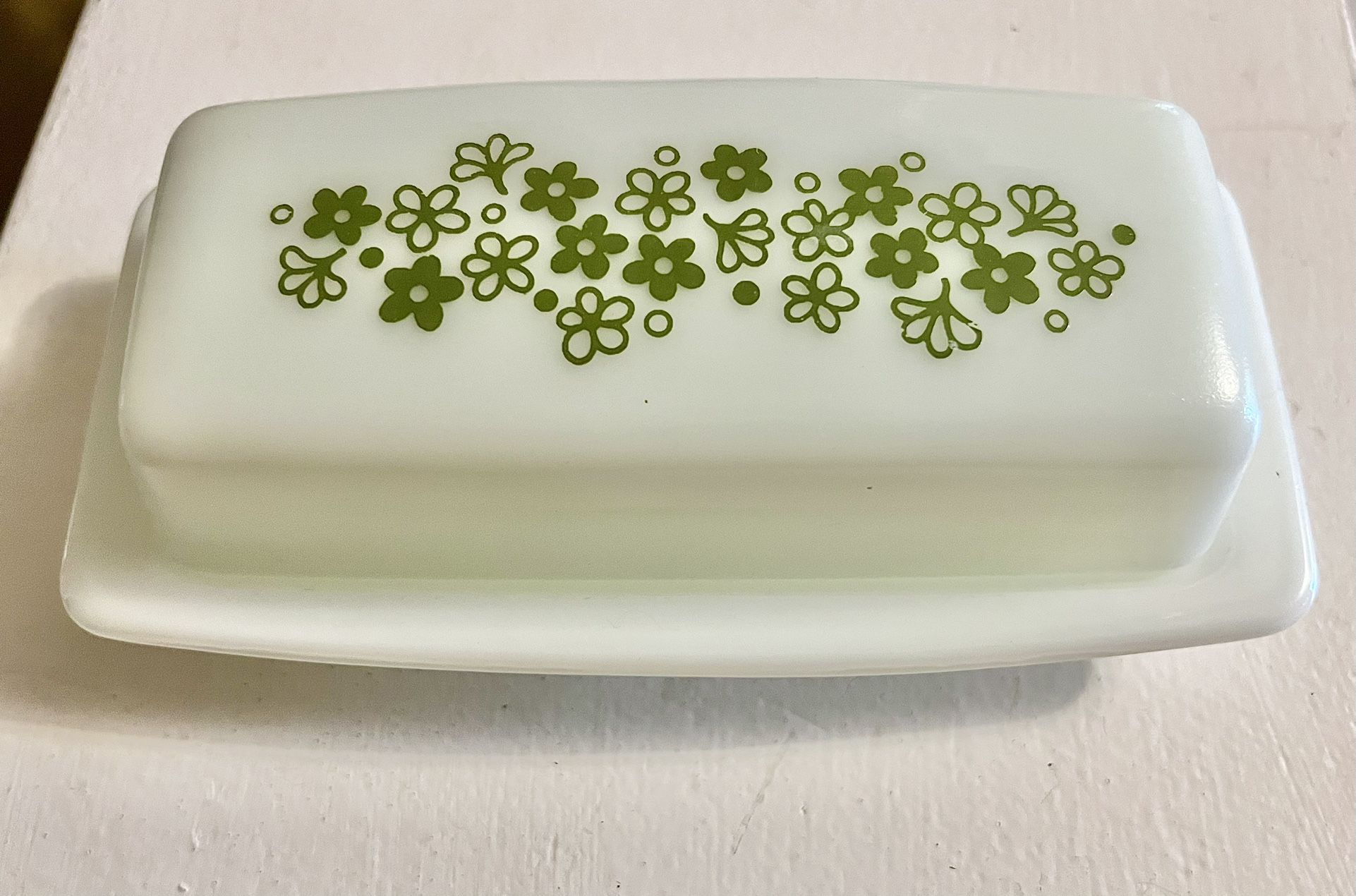 VINTAGE PYREX GREEN FLOWER BUTTER DISH CONTAINER WHITE GREEN Vintage Spring Blossom Crazy Daisy Floral Pyrex 72-B Covered Butter Dish 70s 1(contact info removed) and 80s 1(contact info removed) production run dates. PLEASE LOOK AT ALL THE PHOTOS FOR SPECIFIC DETAILS. We are downsizing and slowly listing items from our family and parents and grandparents households and barn outbuildings