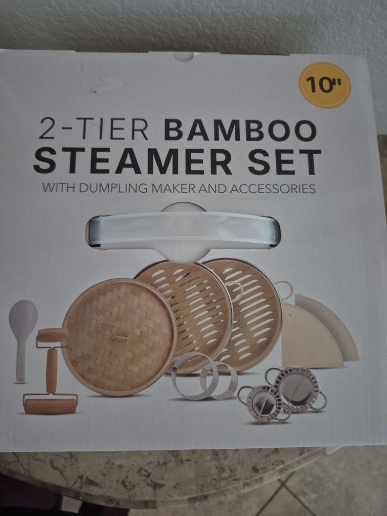 10 inches wide. Bamboo steamer with stainless steel edge reinforcement. Includes stainless steel dumpling molds, round cutter, rolling pin and dough scraper/spreader tool. Cash only pick up Temecula.