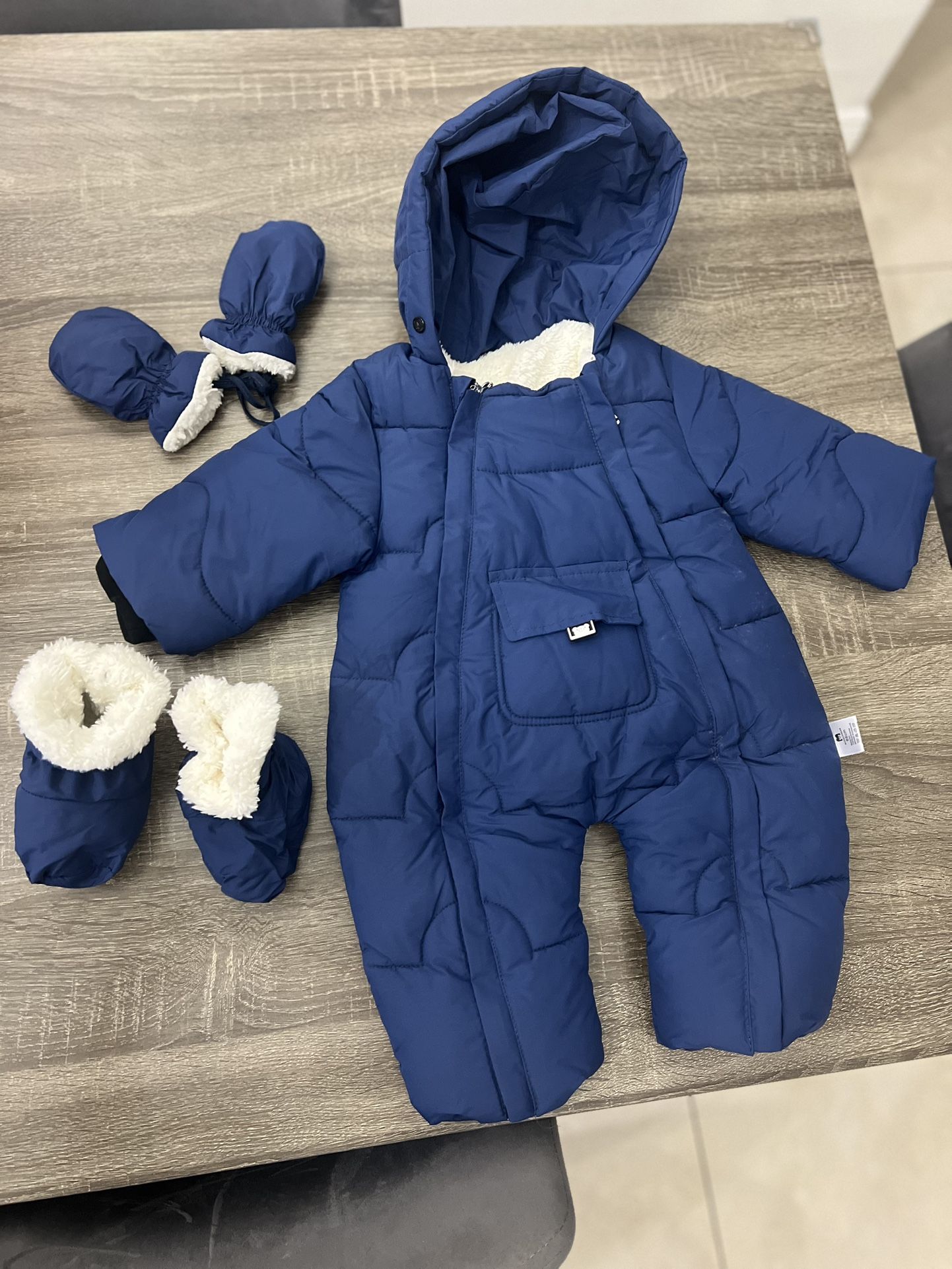 This baby snow suit is perfect. It includes everything in the picture snow suit, booties and mittens. Brand new, never used
