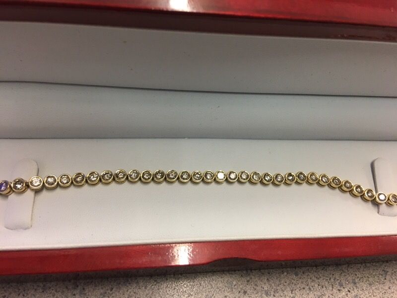 Female tennis bracelet, 14k yellow gold with over 3 karats diamonds weight. For more information contact Edwin at (contact info hidden) or pass by our Cocoa Beach location at 1314 N Cocoa Blvd Cocoa Fl 32922!