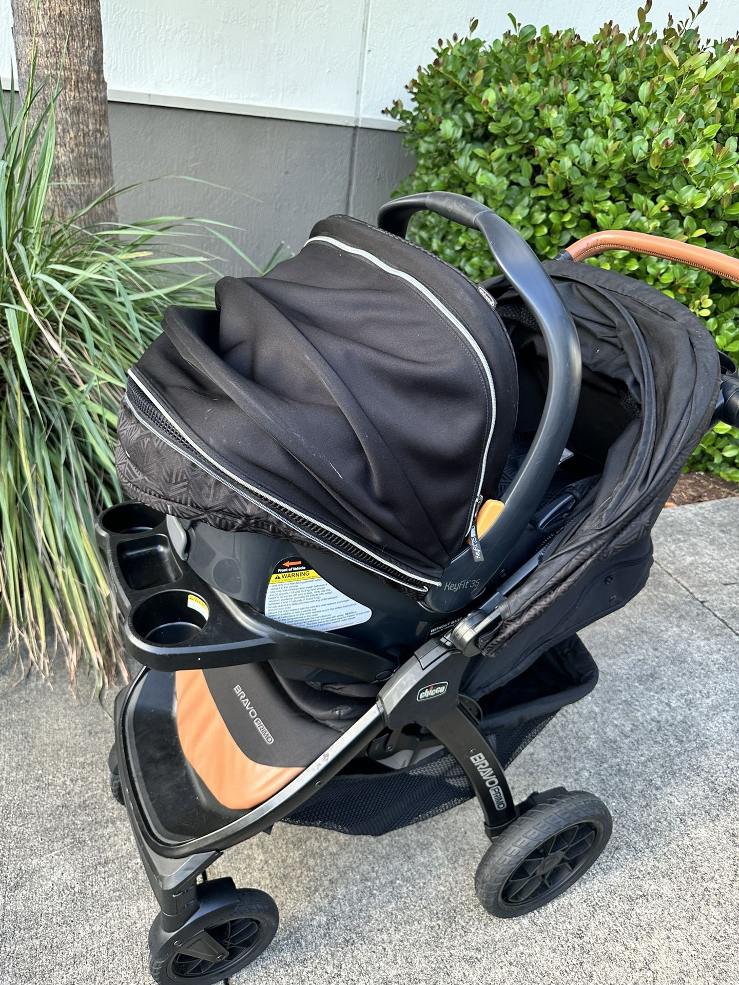 Chicco Bravo Deluxe Stroller System comes with infant car seat, base for car seat and stroller. The stroller has a long pull down hood. The stroller closes with one hand and stands on its own. The car seat comes equipped with car seat cover for added convenience so no need to buy one separate. Stroller is in good condition only has a slight scratch on the cup holder portion