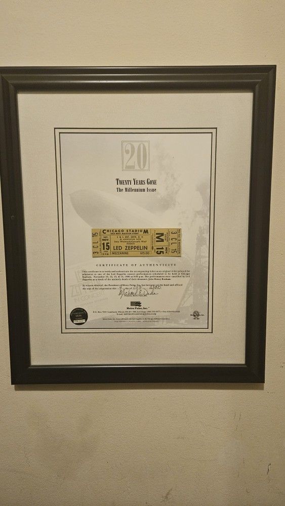20th anniversary Led Zeppelin concert ticket from 1980. Framed and matted. 16 inches wide by 19 inches high. Limited edition #38/2000!