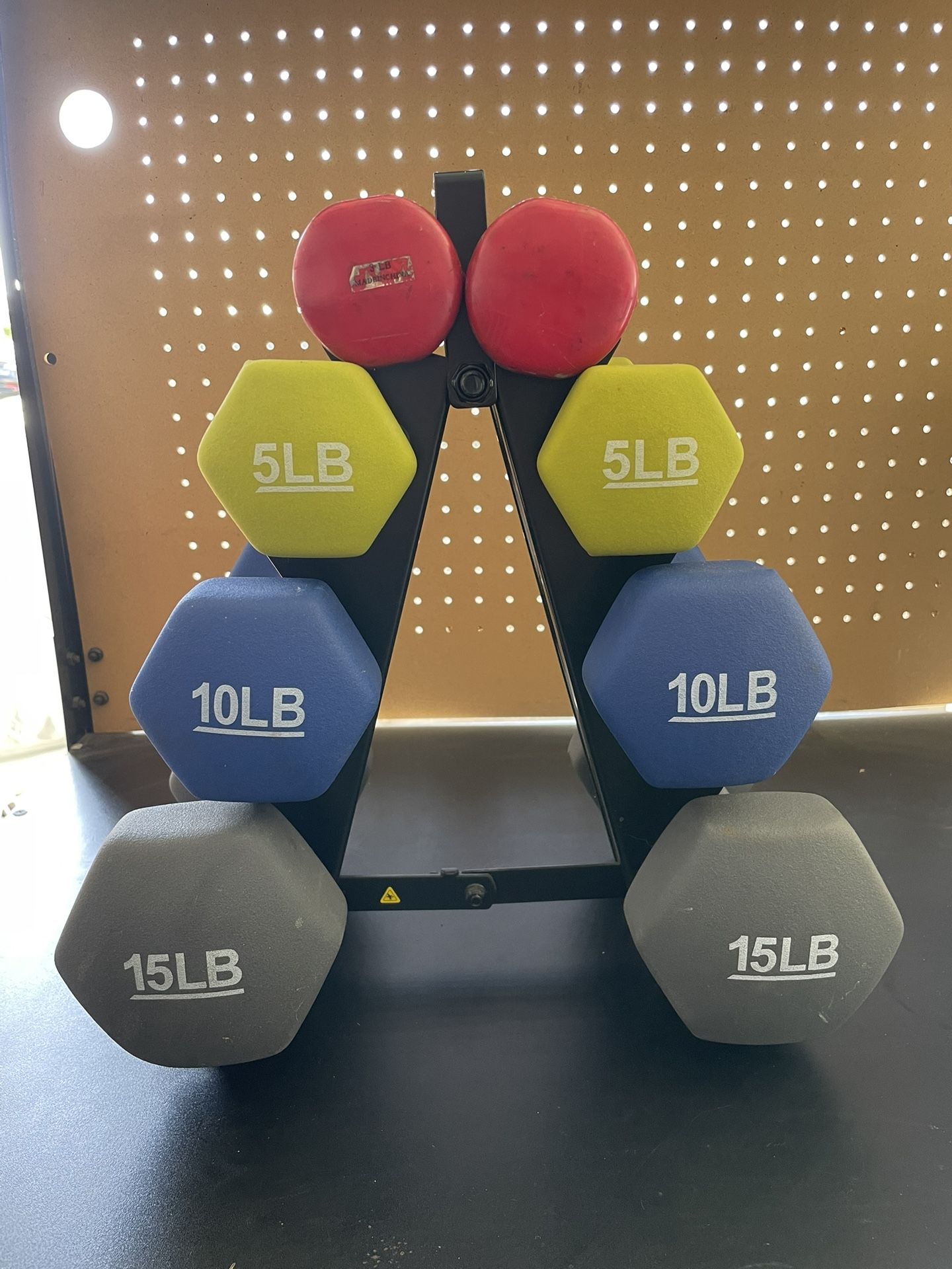 Lightly used Amazon Basics neoprene dumbbell hand weights. 2 each: 5, 10, and 15 pound dumbbells (6 total). Also adding an extra pair of used 3lb weights. Includes storage stand. Currently on Amazon for $85. Pickup outside Gardena Police Department. Cash, Zelle, Venmo accepted.