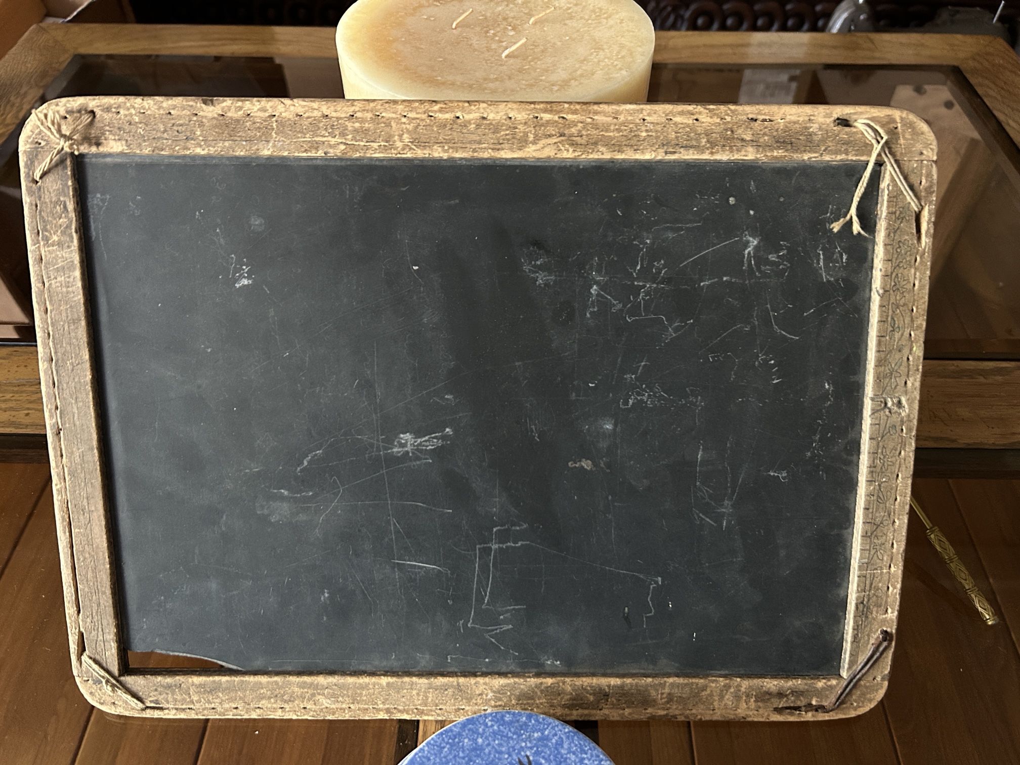 Double sided 10 3/4” x 14 3/4” slate chalkboard. One corner has chip in slate as seen in picture. Design on top wood slat. Great gift for the teacher in your life!