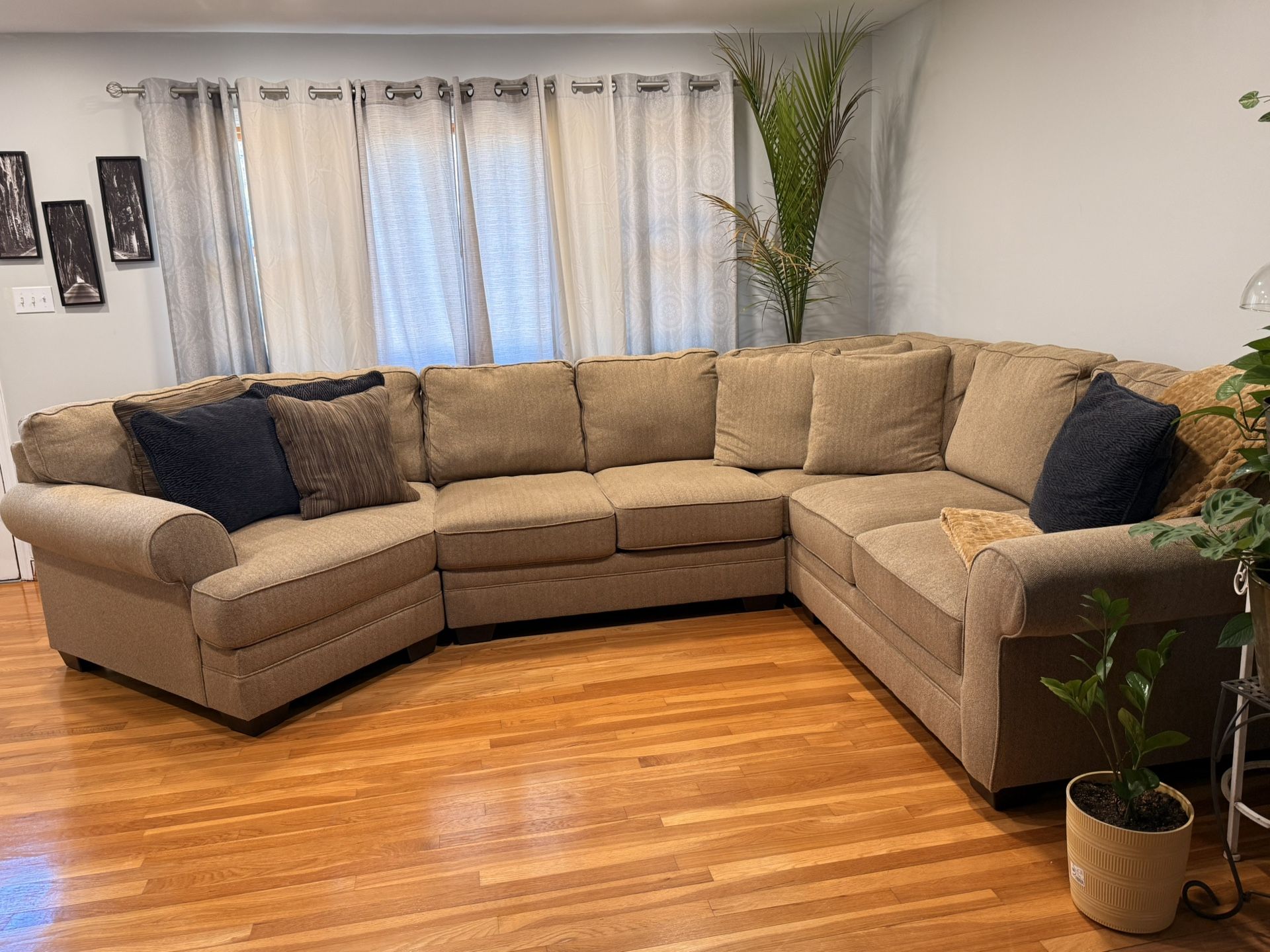Large 3-Piece Sectional Couch, Excellent Condition Neutral beige/tan sectional in excellent condition. No stains, no rips, no damage. Very comfortable and spacious. Includes all pillows shown. Clean and well-kept. Priced for quick sale. Pickup only.