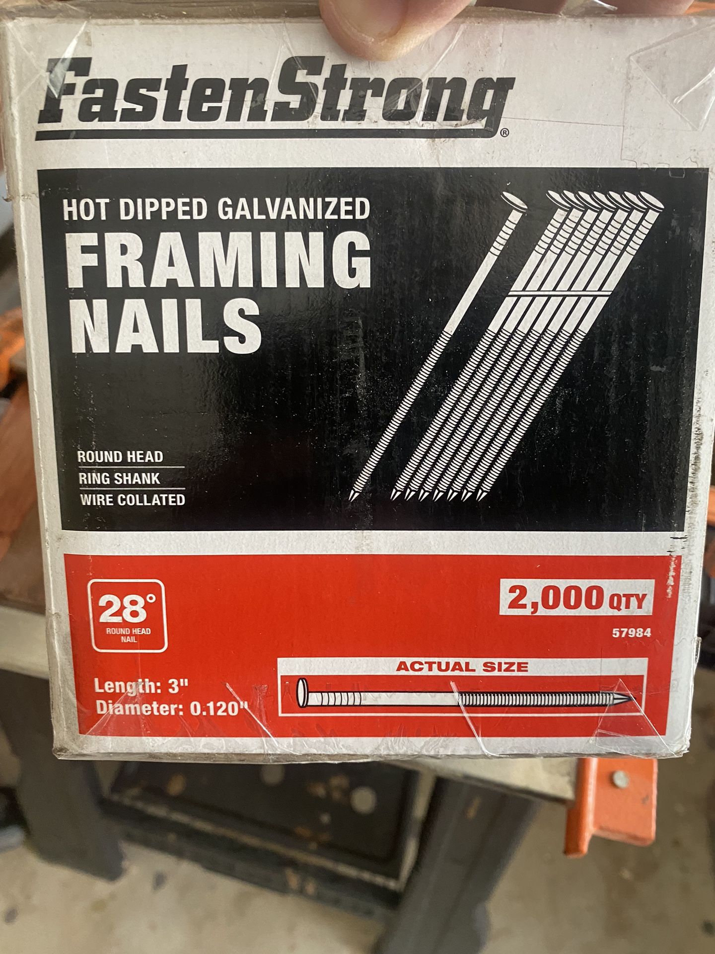 Brand new box of 2,000 framing nails for a 28 degree nailer. I got the wrong ones for my nailer and Harbor Freight wouldn’t not allow a return without a receipt.