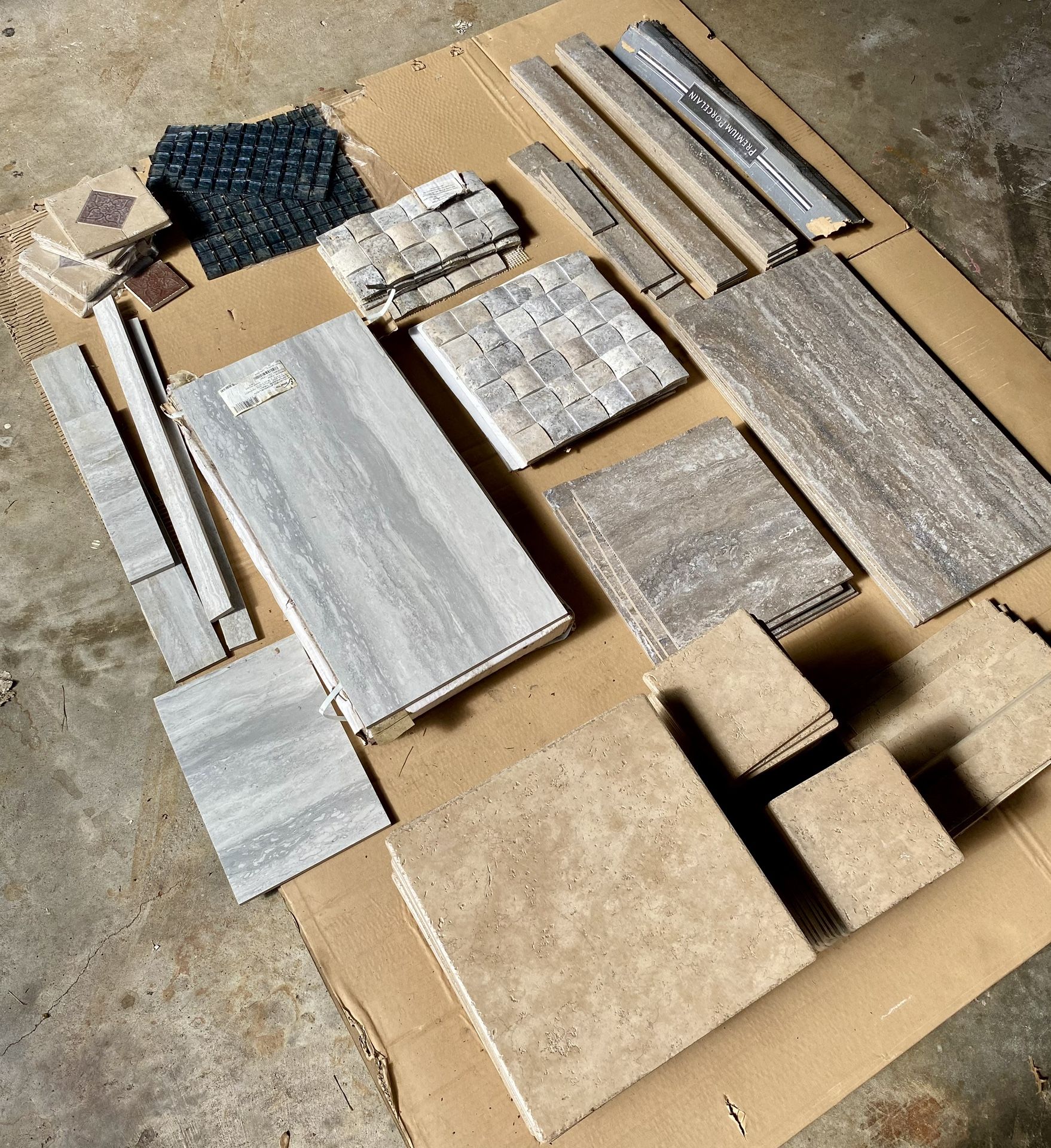 Wall and floor tile - Perfect for the small project! 1) Rialto Noce - Qty. 27, 12x12” x 1/4”, Qty. 43, 6x6” x 1/4” plus Qty. 11 various sized 2) Premium Porcelain - Qty. 4, 23 5/8 x 10 13/16” x 1/4”, Qty. 5, 10 1/2 x @10 1/2” x 1/4”, Qty. 9, 23 5/8 x 2 1/2” x 1/4” plus Qty. 4 random size. 3) Travertine Braid Bone Mosaic - Qty. 4, 11 1/2 x 11 1/3” x3/16”, Qty. 4, 11 1/2 x 6” x 3/16” 4) Glass Squares - Qty. 1, 11 7/8” x 11 3/4” x 1/4”, Qty. 1, 11 3/4” x 6 3/8” x 1/4” 5) Emser Tile - Polished Porcelain, Esplanade Trail - Qty. 7, 23 1/4 x 11 3/8” x 3/16” plus Qty. 11, various size 6) Venice Deco Noce Decorative- Qty. 5, 6x6” x3/16”