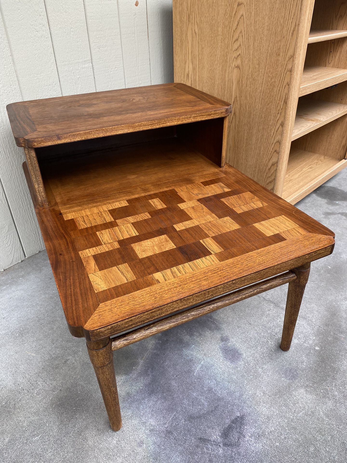 Lane end table from 1960. Still strong and sturdy like any other Lane. Two tier with a cool checkered wooden inlay. Bottom Tier 21” wide 29” deep 14.5” tall Top Tier 21” wide 13” deep 21” tall $300 obo Delivery is available for an additional fee.