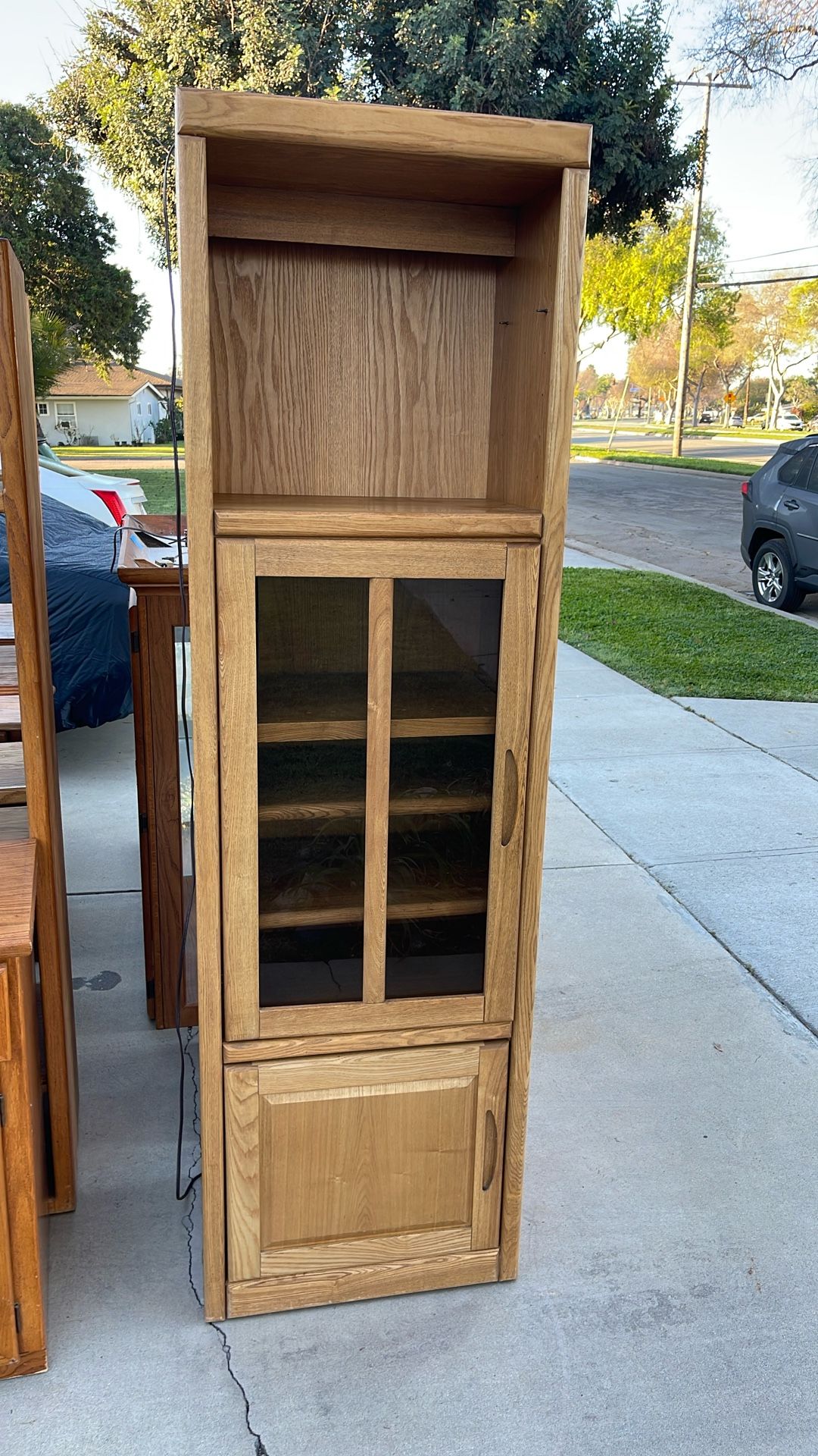Variety of oak furniture good condition 2 piece china cabinet with glass and lights Table that seats 10-12 comes with protective top and 8 chairs recently recovered in a pet and smoke free home 2 side cabinets with a top bridge with lights fits around a full or queen size bed Small TV stand 2 curio style cabinets with glass and lights 2 large multilevel shelves for plants? Photos? Or your favorite collection 2 smaller microwave/ portable center island stands Southwestern style glass top coffee table 6 drawer side by side dresser