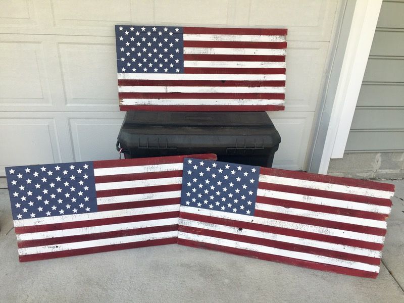 3 wooden American flags ๐บ๐ธ $60 each Naturally weathered wood with outdoor paint. Sealed so they can be hung indoors or out Wooden Stars Measure 21"x42" Pick up in VB off S. Independence and Baxter