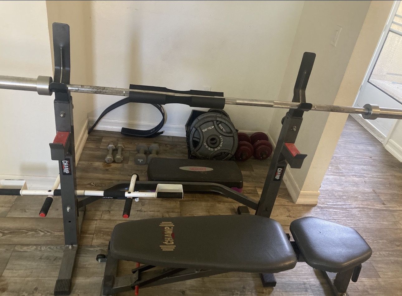Everything for $500 can sell individually or best offer Bar Bar clamps Bench 8ibs(2) weights 5ibs(2)weights Plates: 45(2), 35(2),25(2),10(2),5(4),2.5(2) Lift belt (2)dumb bells weighing up to 15ibs each