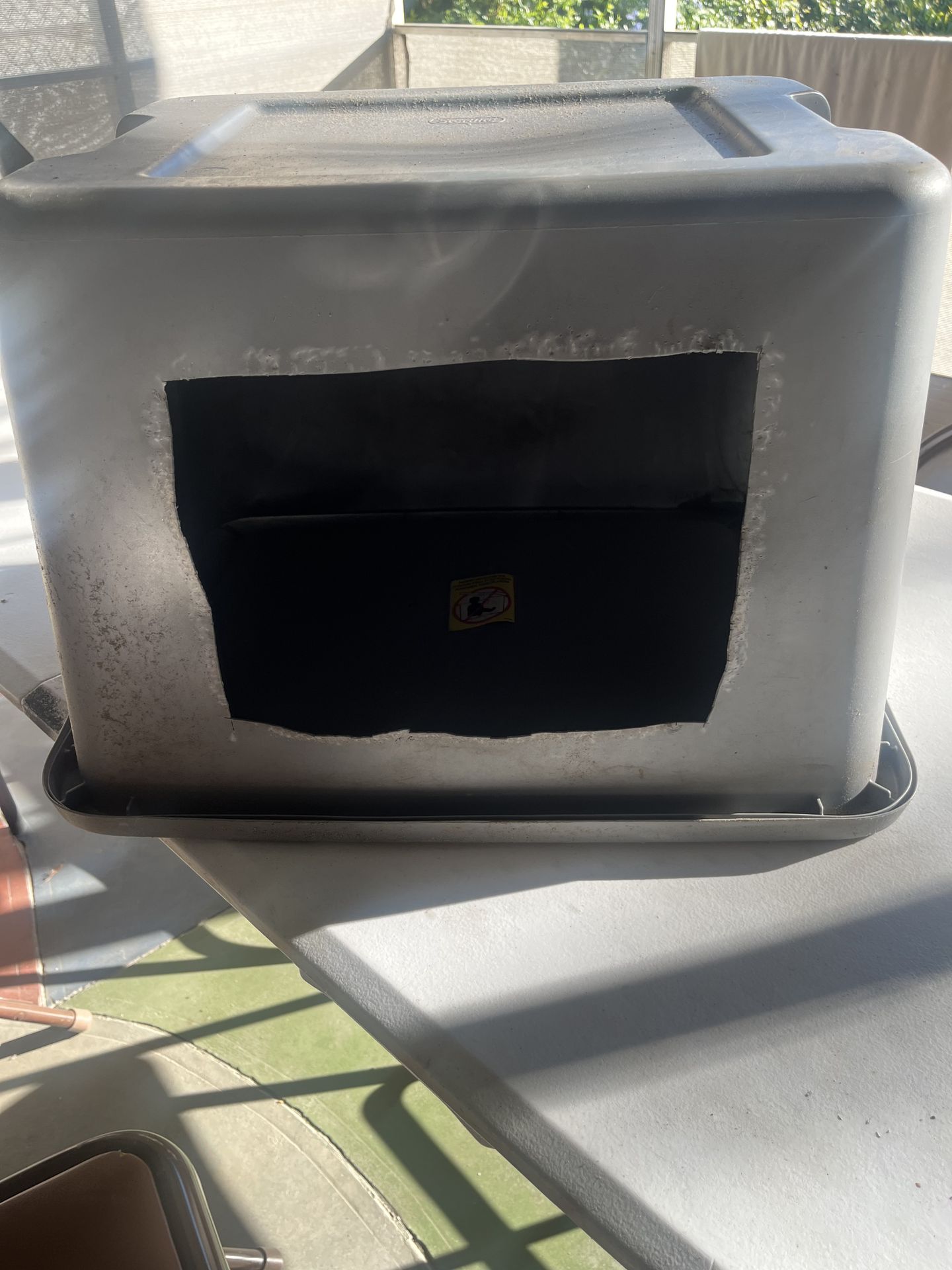 It is a Tupperware storage that was cut and used as a dog house