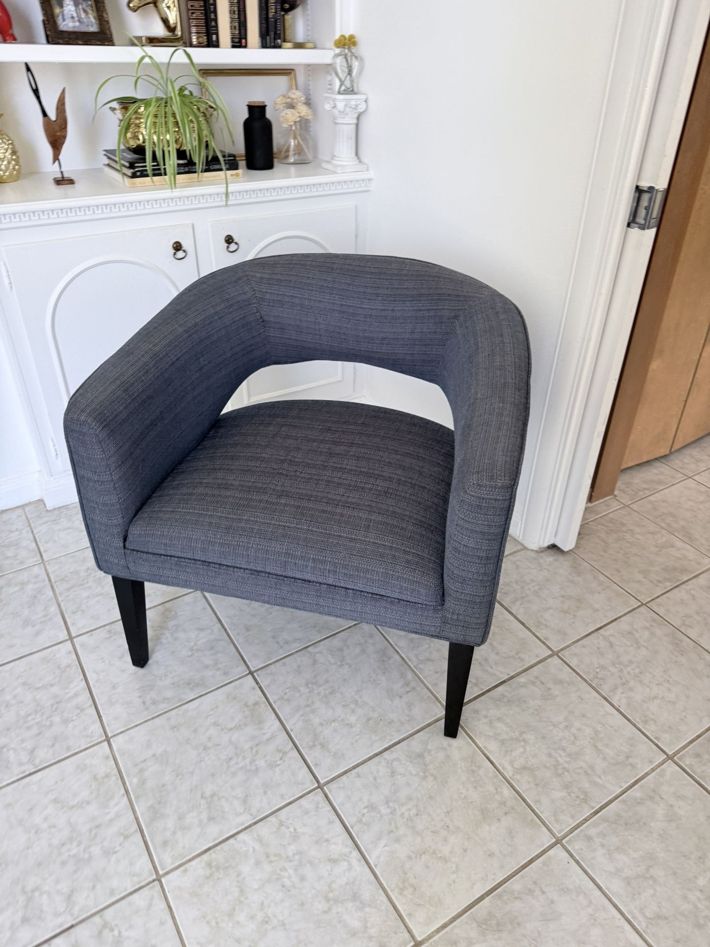 No rips (minor sewing correction). No stains. No pet house. Brand Berkley Home Color Jasper Saphire Material Wood/Upholstery Product Dimensions 27"D x 30"W x 29.5"H Size 30"W 27"D 29.5"H Back Style Open Back