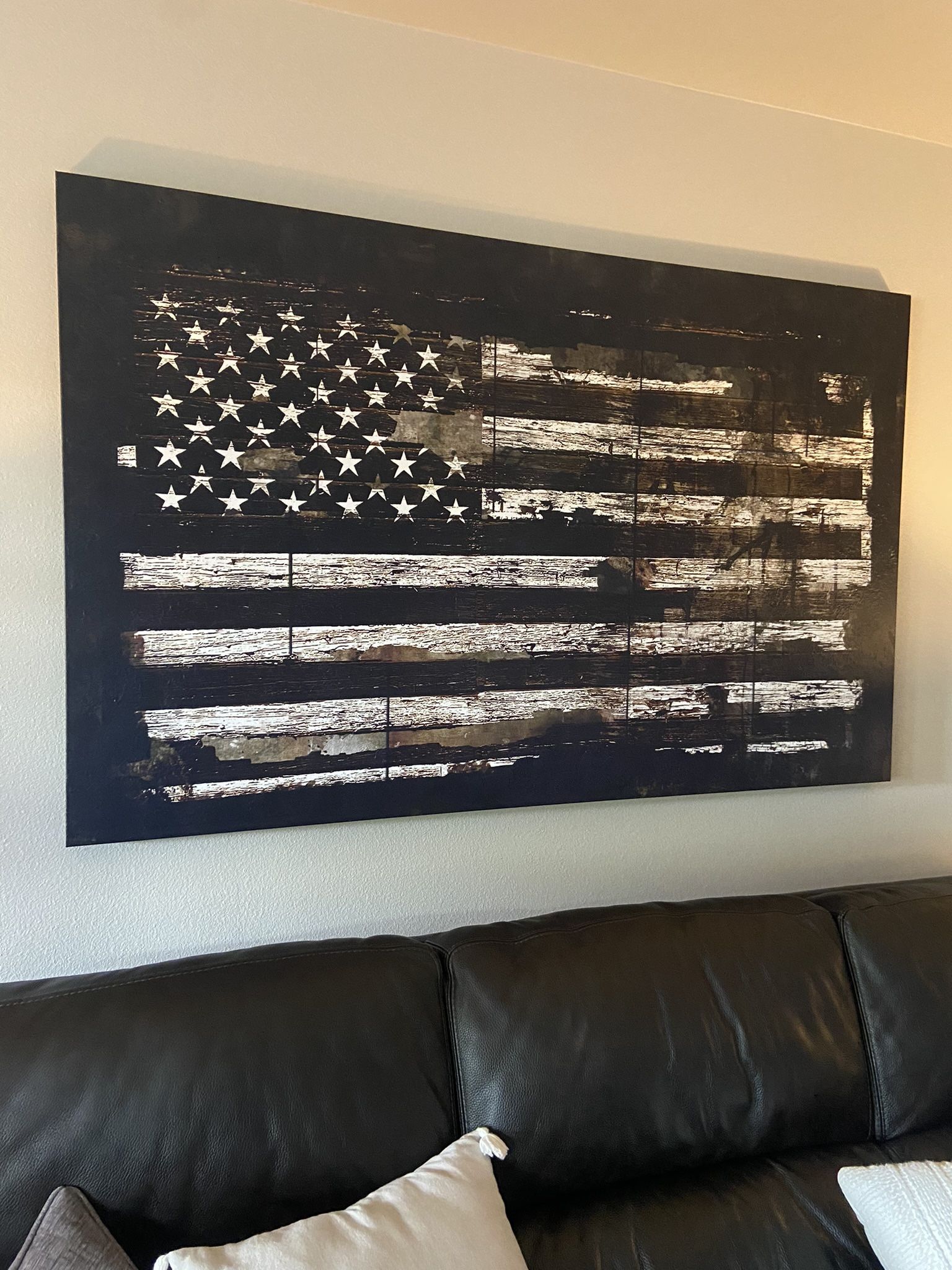 “New” Unique black and white American flag canvas. Perfect condition and from a non smoking home. Easy to hang and measures 64” x 40” and 1.5” thick. Paid over $250.00 for it. Great deal at $100.00.