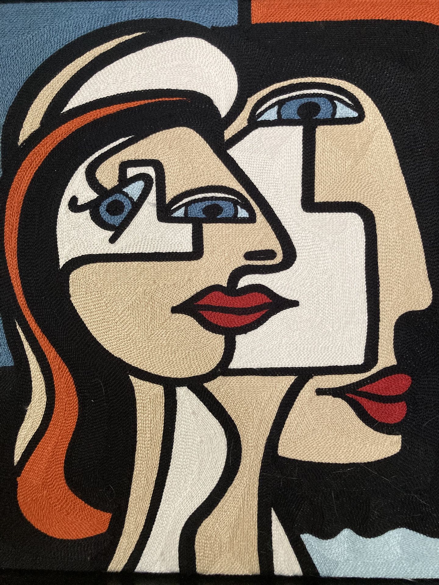 Framed crewel work piece by French contemporary artist Laurent Folco, known for his Cubist-inspired art. Mid century style cubist textile art piece, this one is titled "Ori Tahiti". New with tags. Super cool piece with vibrant colors. 18” x 18” framed and ready to hang.